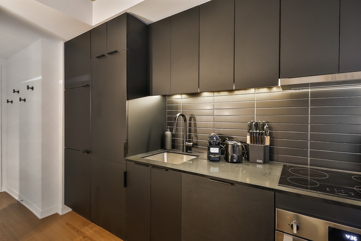 Enjoy your stay in the heart of the city ! Brand new TDC 2 downtown luxury with direct Bell Center access! Revel in comfort in our fully furnished and equipped one-bedroom condo with own private balcony! Your stay includes access to a sauna, pool, gym, skylounge, gaming room, lounge, and terrace with multiple barbecues. Free underground parking, with the subway just minutes away. Without stepping outside, the city is yours to explore. Plus, unwind with complimentary Netflix for the perfect stay