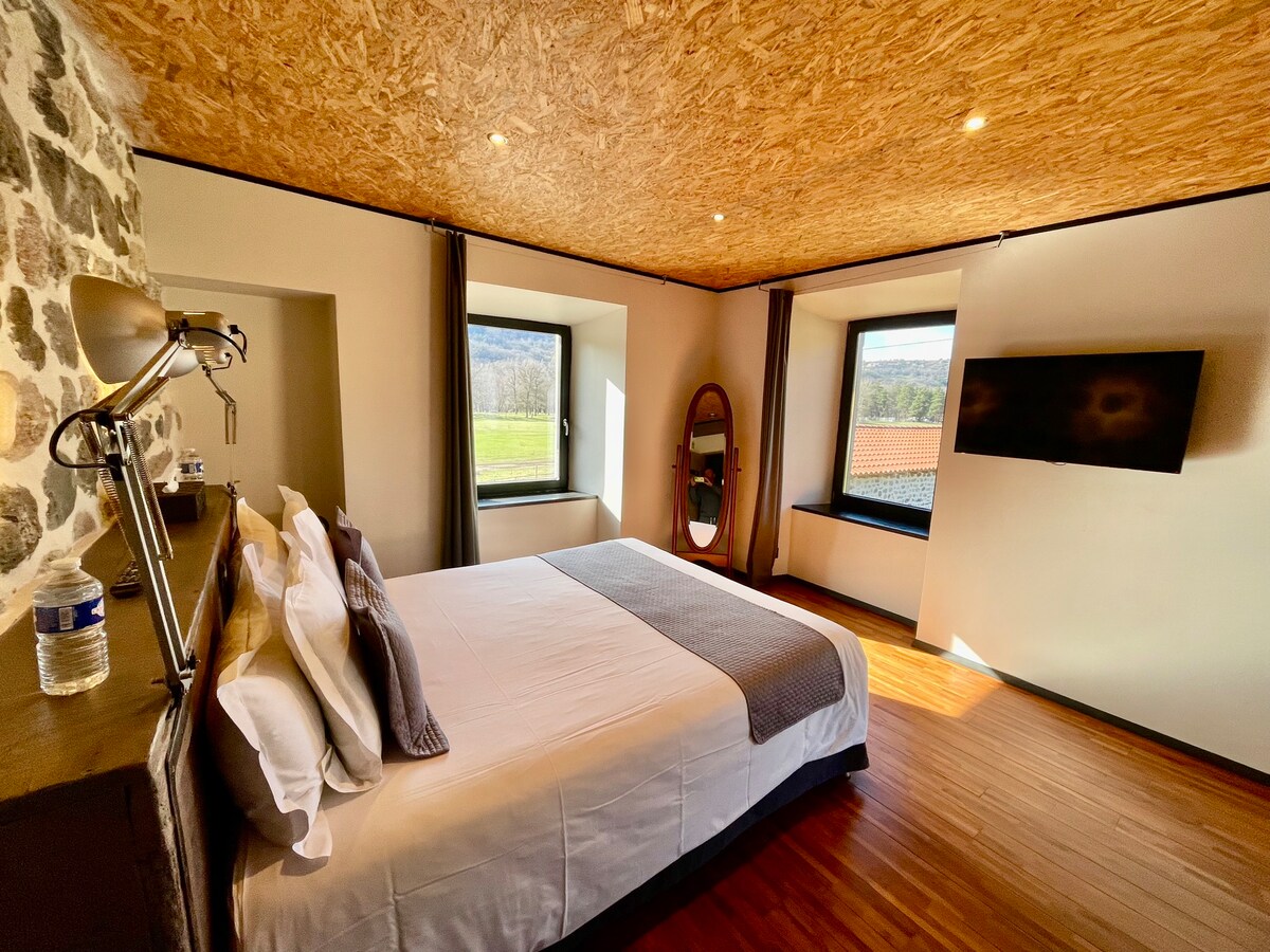 Ta 56-metrska garsonjera, ki omogoča dostop do zasebne terase z več kot 15 m2 z razgledom na ribnik, združuje sodoben slog in značaj starih kamnov. Velika steklena površina, ki ni spregledana, vam bo omogočila, da se boste počutili v osrčju narave. Sprostite se lahko ob kaminu piramid (osvetljeni od oktobra do konca aprila) in v zasebnem spa centru v apartmaju (jacuzzi). Zajtrk bo na voljo s sladko ali slano možnostjo v skladu z vašimi željami.