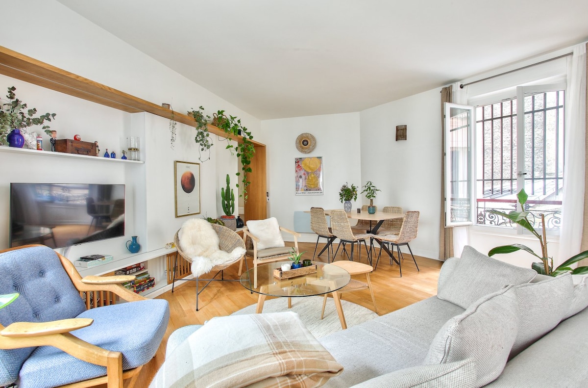 Book with confidence: cancellation conditions are eased from April 1 to April 30, with a full refund up to 5 days before arrival Steps from Place de la République in central Paris, this charming and quiet 3-room apartment features bohemian décor. 2 bedrooms (1 bed 160×200 and two beds 90×200), living room with sofa bed (140×190), open kitchen with dining area, and 2 bathrooms with toilets. Mobile air conditioning. Ideal for up to 6 adults. Luggage drop-off from 11:30 AM, check-in from 3 PM.