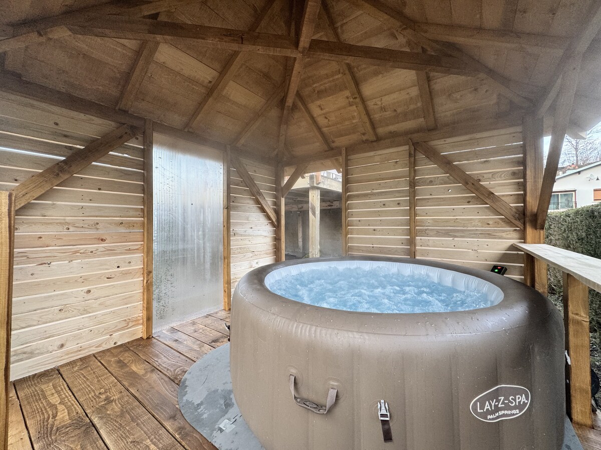 Petit cocon de bien être et de douceur , la cabane à sucre a été entièrement conçue avec des matériaux nobles mêlant le bois , la pierre et le métal. Le jaccuzi , le sauna finlandais , et le filet d’habitation avec vue sur un étang privée donne à notre chalet un cachet unique Vous apprécierez la cheminée du chalet, véritable atout charme, qui crée une ambiance chaleureuse et authentique, parfaite après une journée en plein air.