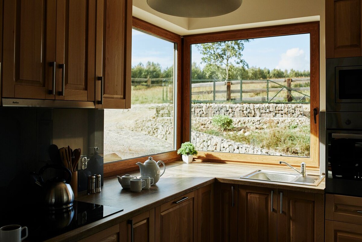 Velika zasebna hiša skozi vse leto, ki se nahaja na samostojni ograjeni namestitvi, ki meji na tri strani gozda. Celoten prostor za vašo izključno uporabo zagotavlja zasebnost in udobje. Torej, če še vedno nimate načrtov za svoje počitnice in sanjate o polnjenju baterij, pozabljanju vsakodnevnih stvari, ponovnem pridobivanju notranjega miru in ravnovesja, vas vabimo v Kashubijo, Pozimi je ogrevanje hiške na deželi kamin, vključen les, Pupile lepo vidno z nami x
