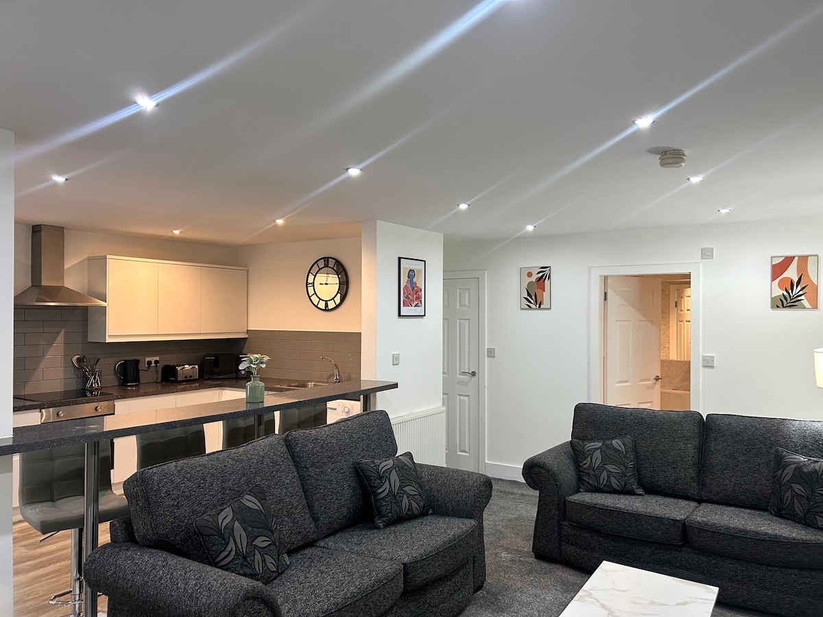 Enter via our Clifton Square entrance.This first floor apartment boasts a bright and spacious, open plan kitchen, with breakfast bar and stools and seated table area. The living area has direct views of Clifton Square. One bright double bedroom with king-size bed, side table, built in wardrobe and mirrored vanity area, a bathroom with shower and toilet, heated towel rail.