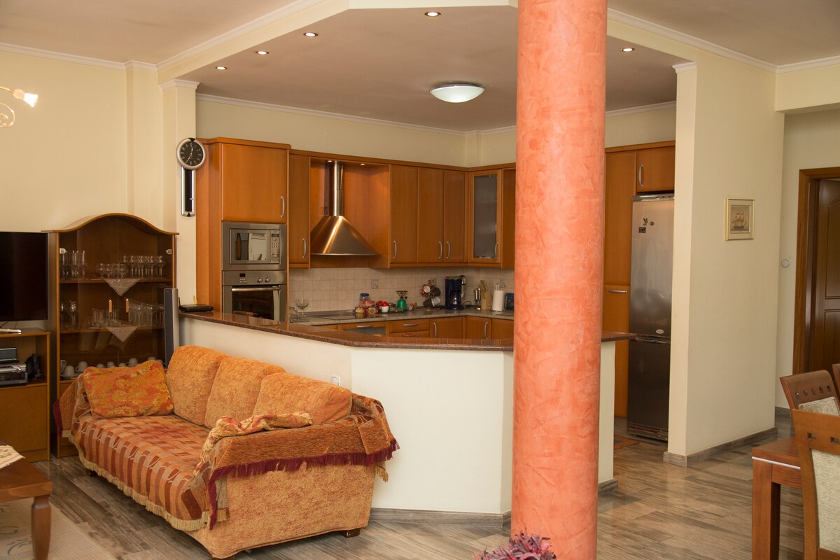 Počutite se kot doma v Serresu - toplo in posebno doživetje! Iščete več kot le prenočišče? Dobrodošli v svojem domu v našem čudovitem predelu, le 10 minut hoje od živahnega središča Serresa. Naše stanovanje se nahaja v 4. nadstropju šestnadstropne stavbe in nudi brezplačno parkiranje, varnostne kamere in dvigala. Z udobno dekoracijo in vsem udobjem. Ponuja prostorno kopalnico, popolnoma funkcionalno kuhinjo, udobno zakonsko posteljo in udobno dnevno sobo.
