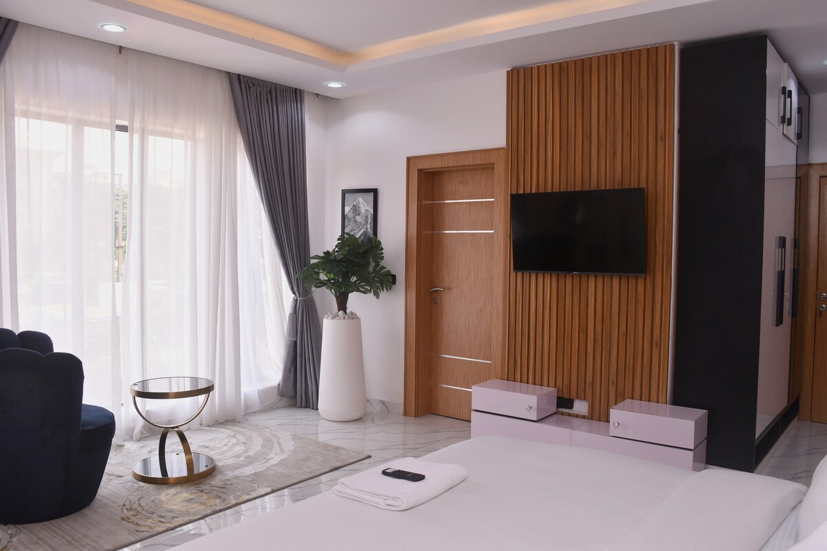 Popolnoma opremljeno minimalistično 3-sobno stanovanje z lastno kopalnico, straniščem za goste, opremljeno kuhinjo, dvigalom, 24-urnim napajanjem in varnostjo, Dstv in internetno storitvijo. Nahaja se v območju Leafy, Serene in High Brow Ikoyi v Lagosu v Nigeriji z enostavnim dostopom do vseh delov otoka Lagos in celinske dežele. Prostor Ločena dnevna soba in spalnica s prho. Celotna gospodinja je na voljo v sklopu nastanitve