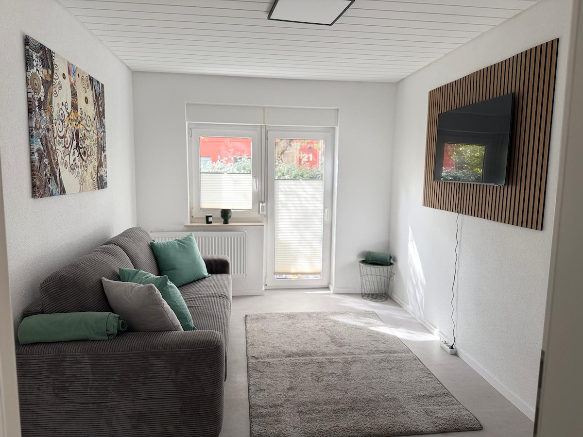 Svetlo poplavljeno sodobno stanovanje približno 50 m2 na cvetočem vrtu z ribnikom in potokom. 200 m do zunanjega bazena. Polnilna škatla v hiši za električni avtomobil po stroškovni ceni. Primerno za pohodništvo in kolesarjenje 20 km do jezera Constance Naravni rezervat Pfrungener Ried