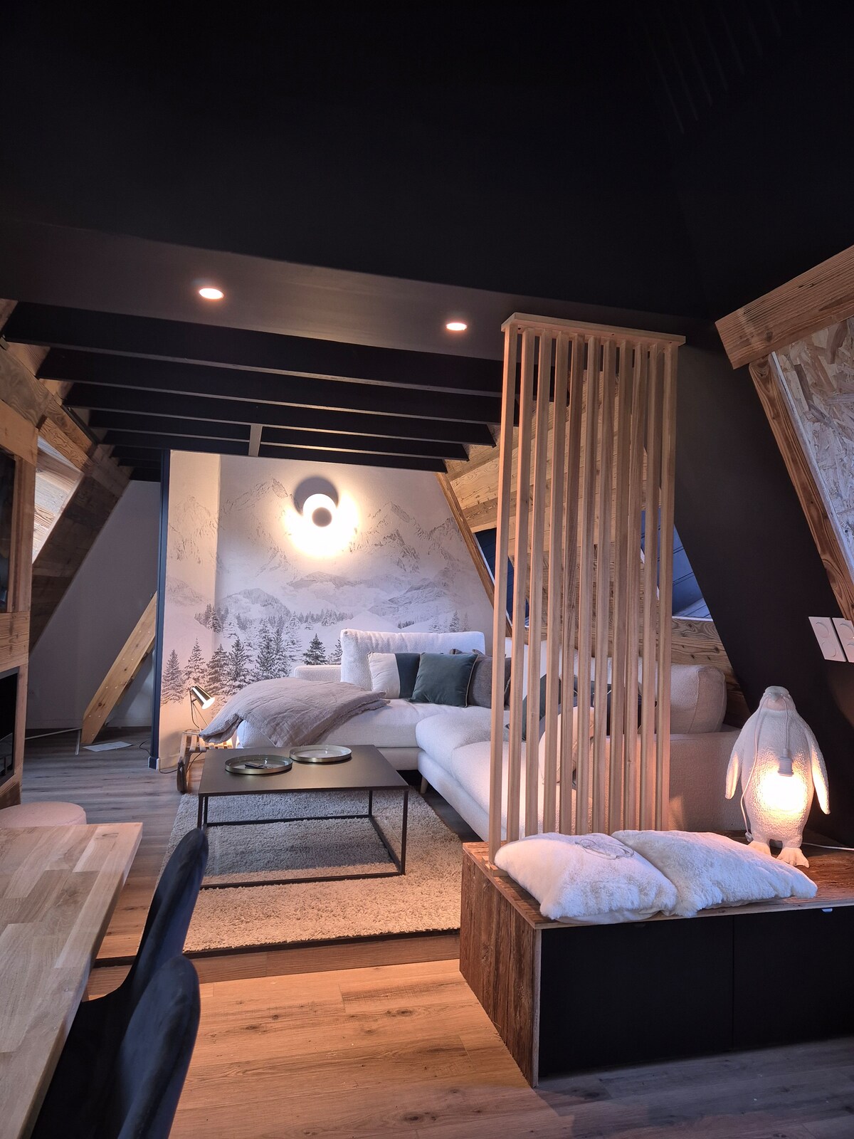 Sprostite se v tem mirnem in elegantnem, popolnoma prenovljenem planinskem domu, v bližini prevozov (150 m) in gorskih poti (30 m). Idealen za 6 oseb je sestavljen iz 3 spalnic in spalnega prostora. DRC: 1 postelja 160 + kopalnica + stranišče 1 postelja 160 + kopalnica A L NADSTROPJE pod strehami 1 postelja v 140. letih +2 postelji v 80*190 + kopalnica. Dnevna soba je opremljena z 1 kaminom na bioetanol (na zahtevo) s pogledom na gozd in gore. 1 zatočišče miru na robu gozda.