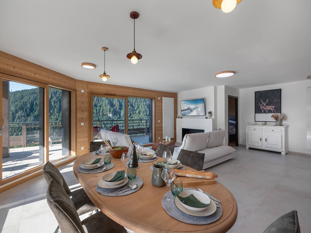 Loft d’exception de 200 m² avec vue panoramique spectaculaire à 240° sur les Alpes. ✨ Deux terrasses couvertes XXL face aux montagnes, pour profiter pleinement été comme hiver • 1 terrasse bien-être avec jacuzzi & sauna • 1 terrasse repas avec salon extérieur & plancha Idéal pour se détendre face au panorama, profiter d’un bon repas avant d'admirer le coucher de soleil Ambiance chaleureuse avec cheminée, cuisine haut de gamme et chambre élégante. À 5 min des pistes de ski Lac Léman à 30 min