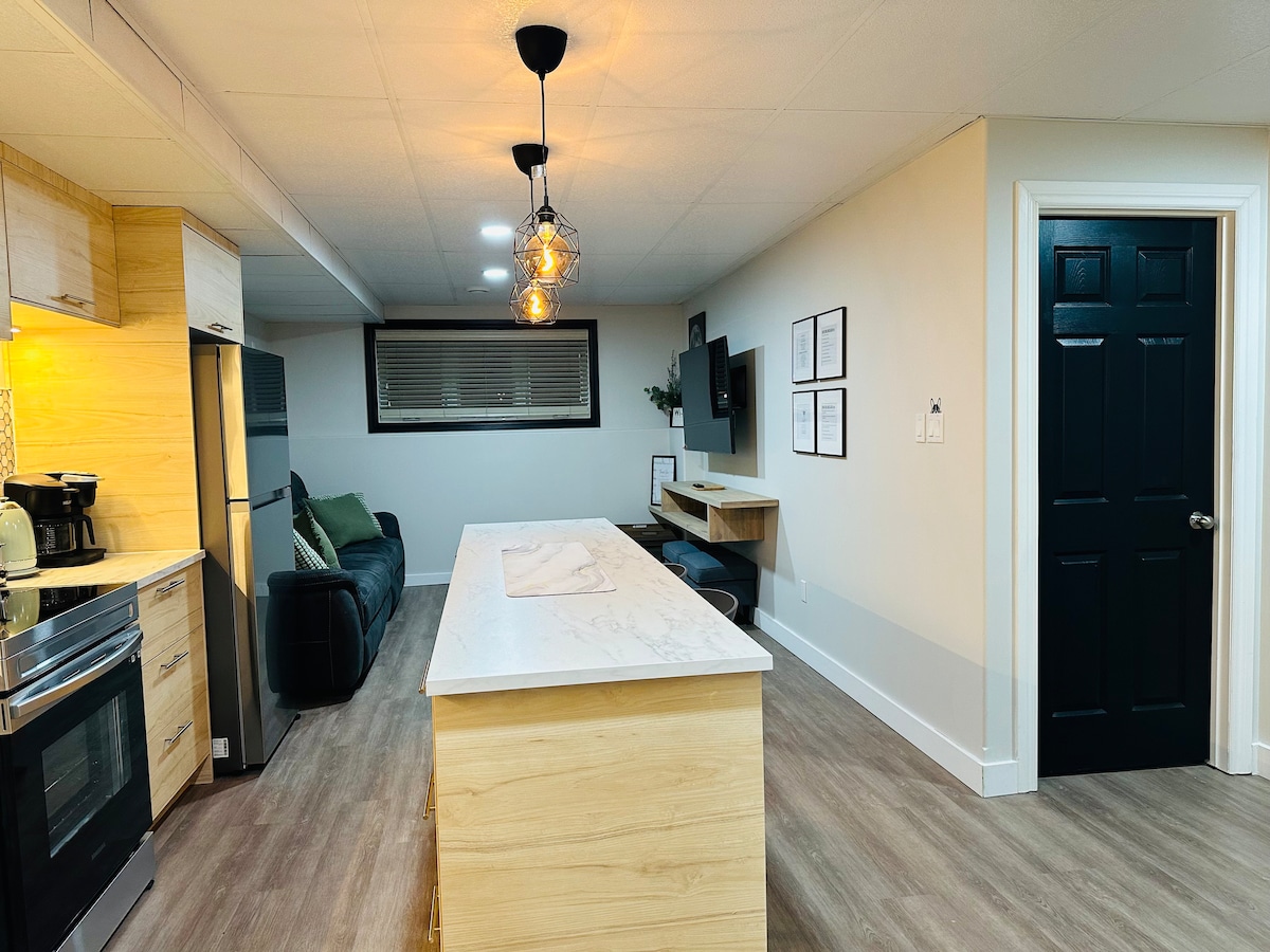 This stylish place to stay is perfect for a cozy home-like feel while working away. The upstairs features 1 master bedroom with king bed and en suite, and a second bedroom with a queen size bed. Kitchen has dishes/cutlery, pots, pans, blender, microwave, fridge, kitchen table, cozy living room with gas fireplace. satellite, netflix, disney+, nhl package. There is laundry in the basement has 2 bedrooms with queen size beds, living room , bathroom and laundry