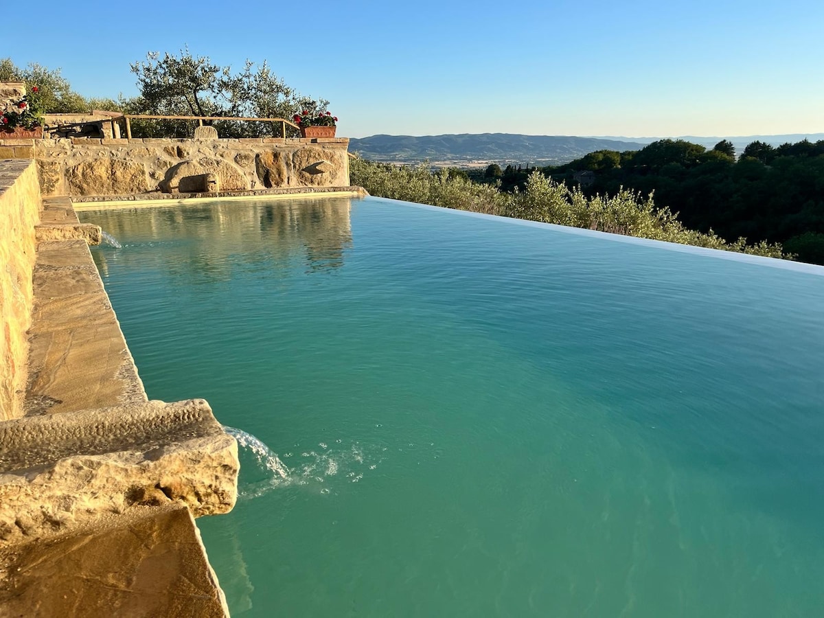Un' antica villa con piscina naturalistica con spettacolare vista panoramica, che supera le stesse immagini fotografiche, restaurata con grande qualità ed immersa in un grande e meraviglioso parco naturalistico di 25 ettari, esclusivo per gli ospiti, a soli 2 km dal centro di Assisi. Il casale può ospitare fino ad un massimo di 12 persone. Ideale per chi ama la bellezza della natura, la pace e la tranquillità assoluta, senza allontanarsi troppo dai centri abitati.
