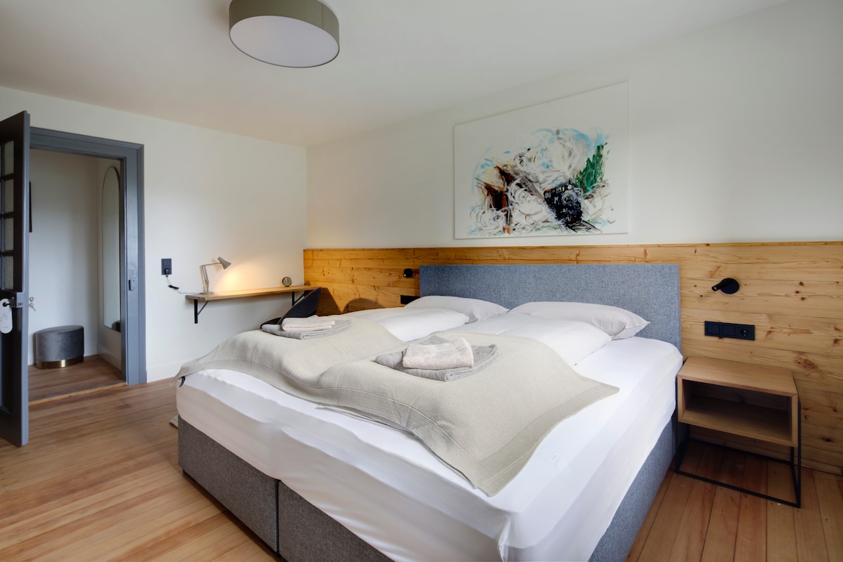 Mit Liebe eingerichtetes 2 Zimmer-Apartment "Herzgrün" (36 qm) für 2 Personen (+ Baby). Traumblick vom Balkon und Sauna im Haus (gemeinschaftlich genutzt gegen Gebühr). Lass das Auto in der Tiefgarage stehen und starte deine Wanderung direkt vom Haus. Viele Sehenswürdigkeiten in der Umgebung. Zwei Skiliften sowie Langlauf-Loipen fußläufig (bei guter Schneelage)