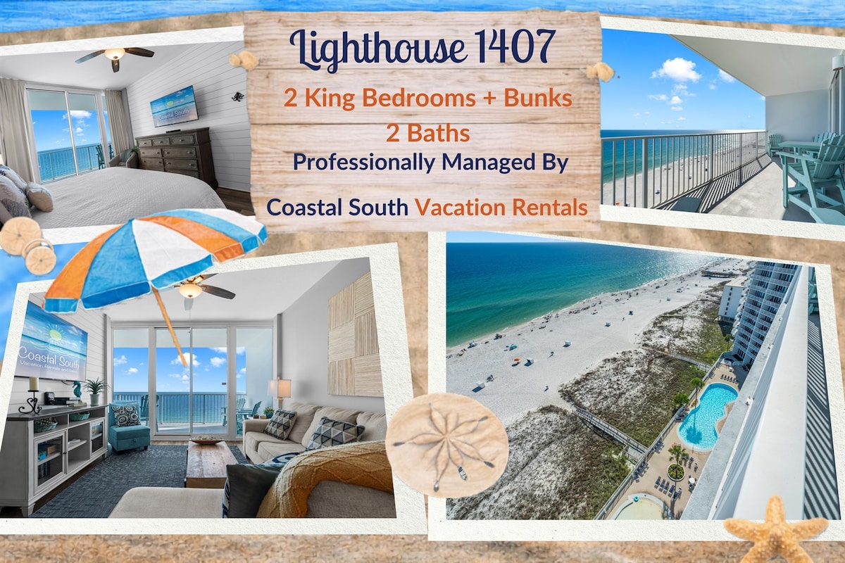 Stanovanje ob plaži v 15. nadstropju v svetilniku. 2 BR/ 2 BA plus in dodatna pogradna soba. Udobno spi 6 oseb z 1 zakonsko posteljo (King) v glavni spalnici, 1 zakonsko posteljo (Queen) v sobi za goste in pogradom z enojnima posteljama (xl) v pogradni sobi. Uživajte v naši popolnoma opremljeni kuhinji. Televizija v vsaki sobi skupaj z DVD-predvajalniki. Pralni in sušilni stroj, brezžični internet. Razgled je dih jemajoč z okni od stene do stene in od tal do stropa ter drsnimi vrati, ki vodijo do balkona iz dnevne sobe in glavne spalnice.
