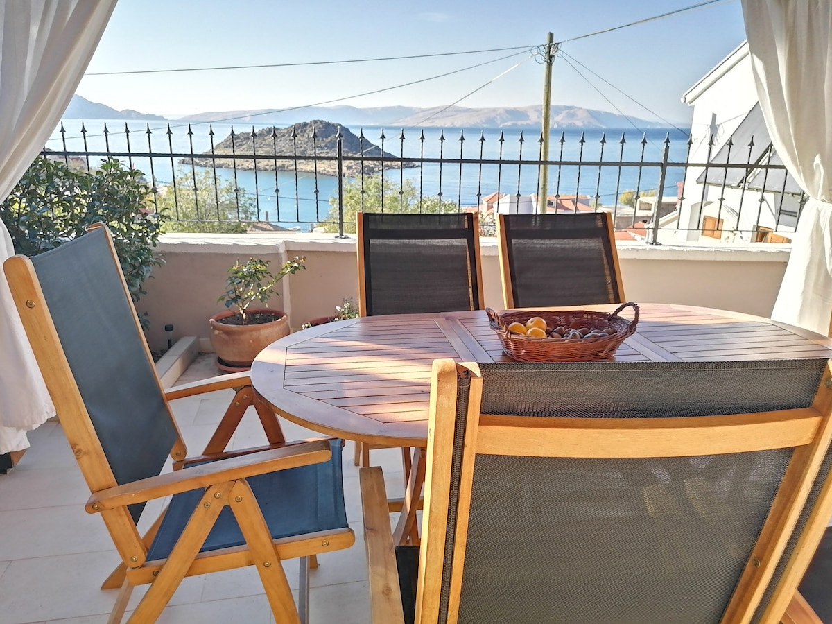 Charming studio apartment with a beatiful panoramic sea view, only 100 m from nature sand beach below. The apartment is located in small and guite village Kampor on island Rab, also known as Happy Island. Location is only 10 minutes from center of town Rab (5 km).