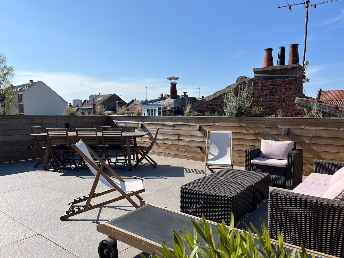 Predelano 115 m2 varno bivališče z veliko teraso, obrnjeno proti jugu, veliko dnevno sobo na odprti kuhinji, 3 spalnice, vključno z eno na medetaži z vsako posteljo za dve osebi , zavarovanim parkirnim mestom, 10 minut od Lilla in v bližini podzemne železnice in tramvaja ter 10 minut od velikega stadiona Pierre Moje bivališče je primerno za družine. Ko najamem prenočišče, bivam pri prijatelju na istem nivoju. Če imate kakršnekoli težave, sem v bližini, da vam pomagam. Majhni sprejemi ali zabave so prepovedani