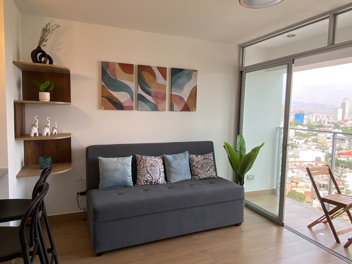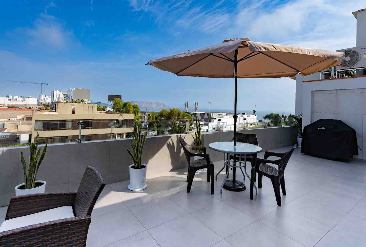Uživajte v Barrancu, stopnicah od Mirafloresa in Malecon de Larcomar. To sodobno stanovanje ponuja spektakularen razgled na morje iz prostora ter dostop do bazena in masažne kadi s 360-stopinjskim razgledom na mesto in morje. Idealno za pare, družine ali delo na daljavo z visokohitrostnim Wi-Fi-jem. Non stop varnost, samostojni vstop in hišni ljubljenčki so dobrodošli. Z veseljem vam bom pomagal odkriti dejavnosti, kot sta deskanje ali jadralno padalstvo v Mirafloresu. Živite v udobju, zasebnosti in na privilegirani lokaciji.