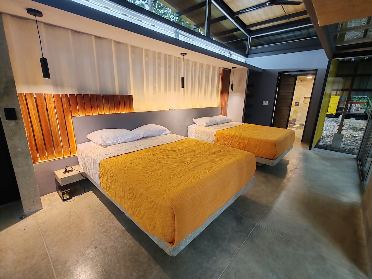 Če je šik modernizem bolj vaš slog, vas vabimo, da odkrijete naša na novo zgrajena prenočišča, ki so diskretno nameščena ob nacionalnem parku Cahuita in z zasebnim bazenom samo zase. Ti čudovito oblikovani 2 spalnici (obe z lastno kopalnico) prenočišča, udobno spijo 6 prenočišč. Vabimo vas, da uživate v kuhinji/bivanju v ameriškem slogu, medtem ko se sprostite v hladnih klimatiziranih prostorih in se namakate v neprekinjenem razgledu na gozd in slastne tropske vrtove.