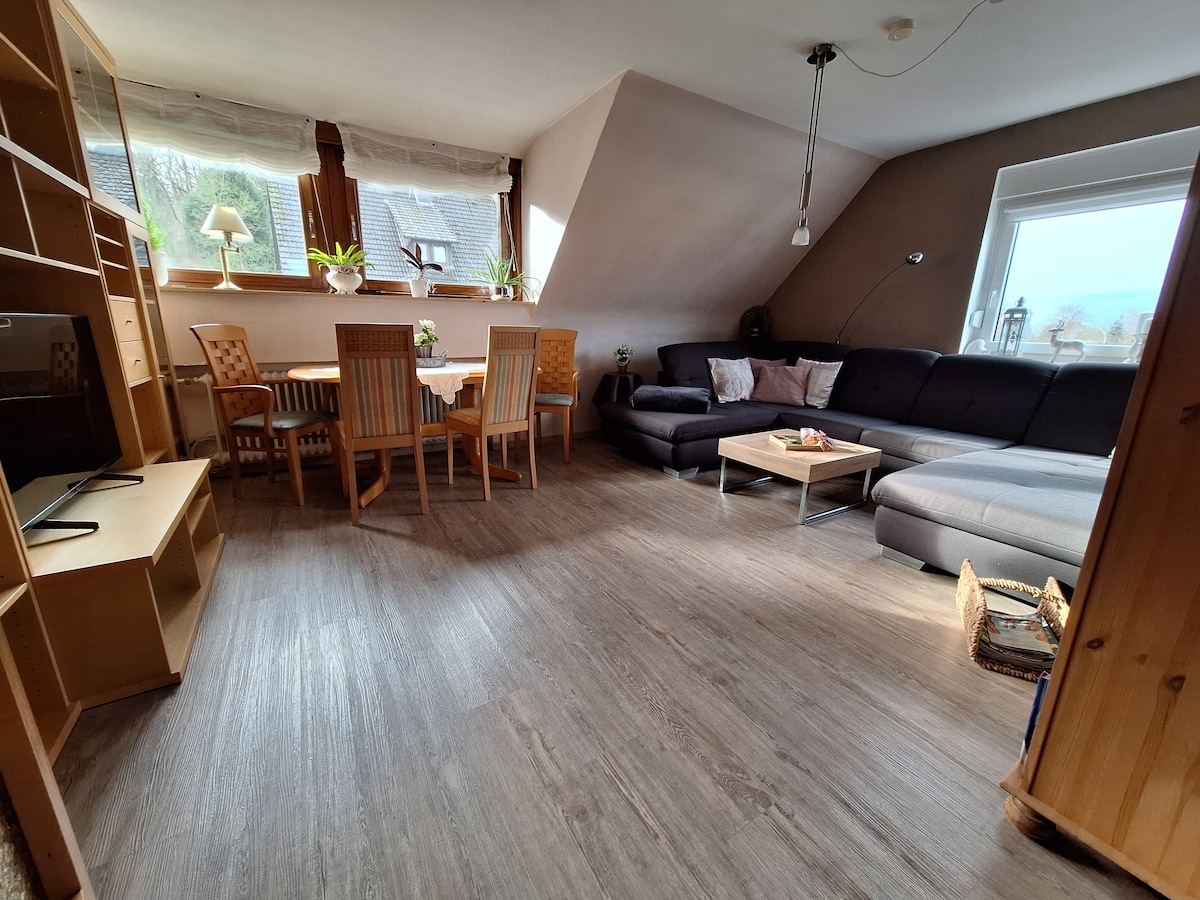 Naše očarljivo 2-sobno stanovanje na mirni lokaciji neposredno ob gozdu je idealno za kratkotrajna bivanja ali sproščujoče počitniško bivanje za 2 osebi (3 osebe lahko spijo v WZ/kavču). Stanovanje se nahaja v zgornjem nadstropju naše hiše in poleg WZ in SZ ima tudi sodobno kopalnico s prho in dobro opremljeno kuhinjo. Poleg tega hribska lokacija hiše omogoča pogled na deželo Schaumburger. Pomembno nam je, da se v naši udobni nastanitvi počutite popolnoma udobno.