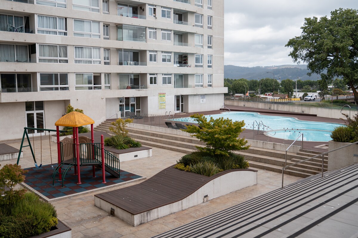 Sprostite se z vso družino v tem prenočišču, kjer lahko dihata mir in narava. Department Located in strategic sector of the great Concepción, in the beautiful Barrio de Brisas Del Sol, steps from the Casino Marina del Sol, Puerto Marina, Espacio Marina, Antu Parque de Diversiones and Restaurante Safari. Blizu nakupovalnega središča Plaza del Trebol,✈️letališča, klinik, supermarketov, univerz in bencinskih črpalk. 15 minut od središča Concepcióna in 20 minut od Talcahuana.