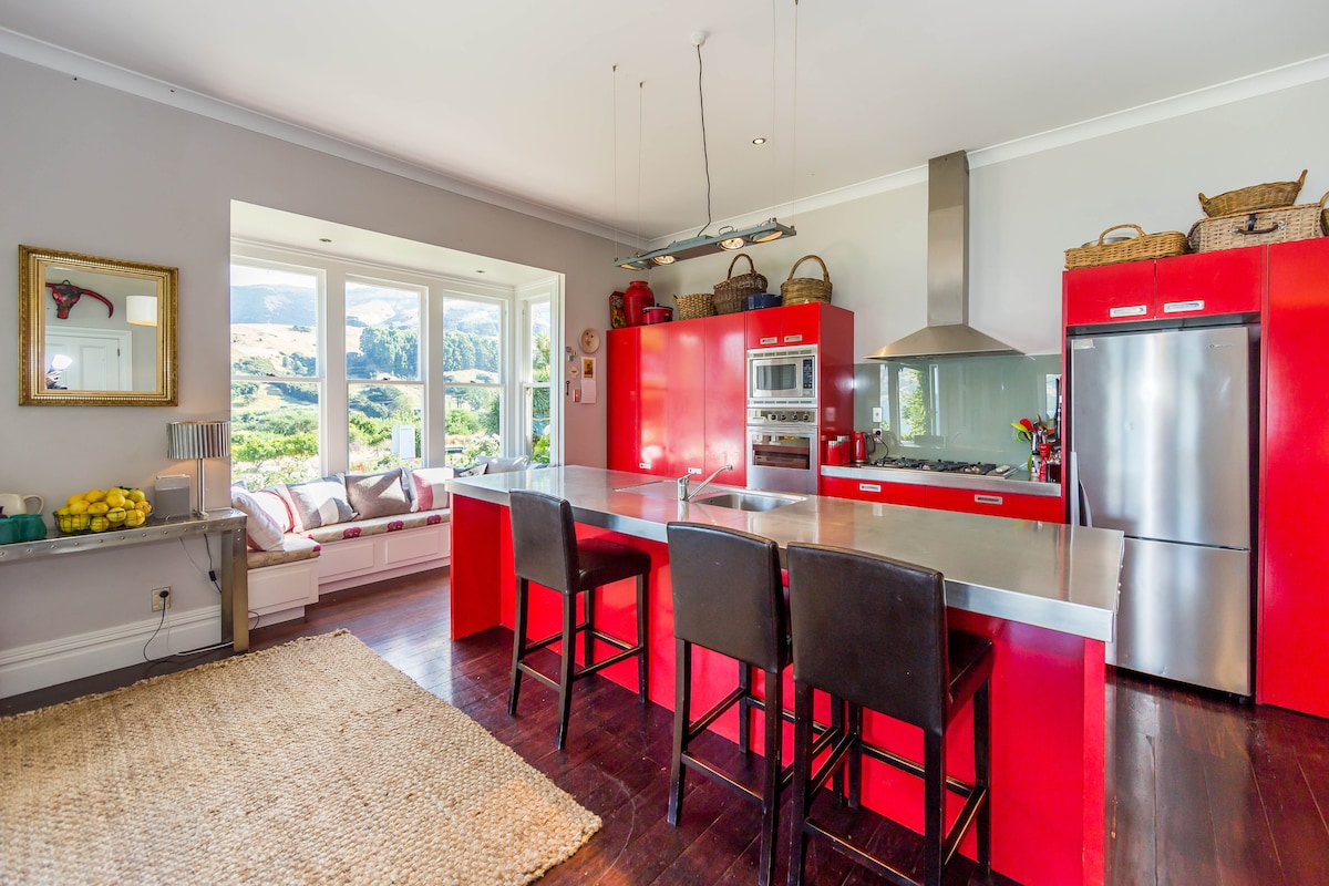 This charming villa, situated in the heart of Wainui, is full of character. With panoramic views overlooking Akaroa Harbour and the surrounding hills, this is a superb spot to relax and unwind. Come and enjoy the unique environment any time of year. This spacious family home has 4 (+1) bedrooms, a kitchen/living room with a large log burner, and another living/dining room with an open fire, both opening onto the veranda. I look forward to hosting you in my delightful home and its surroundings.