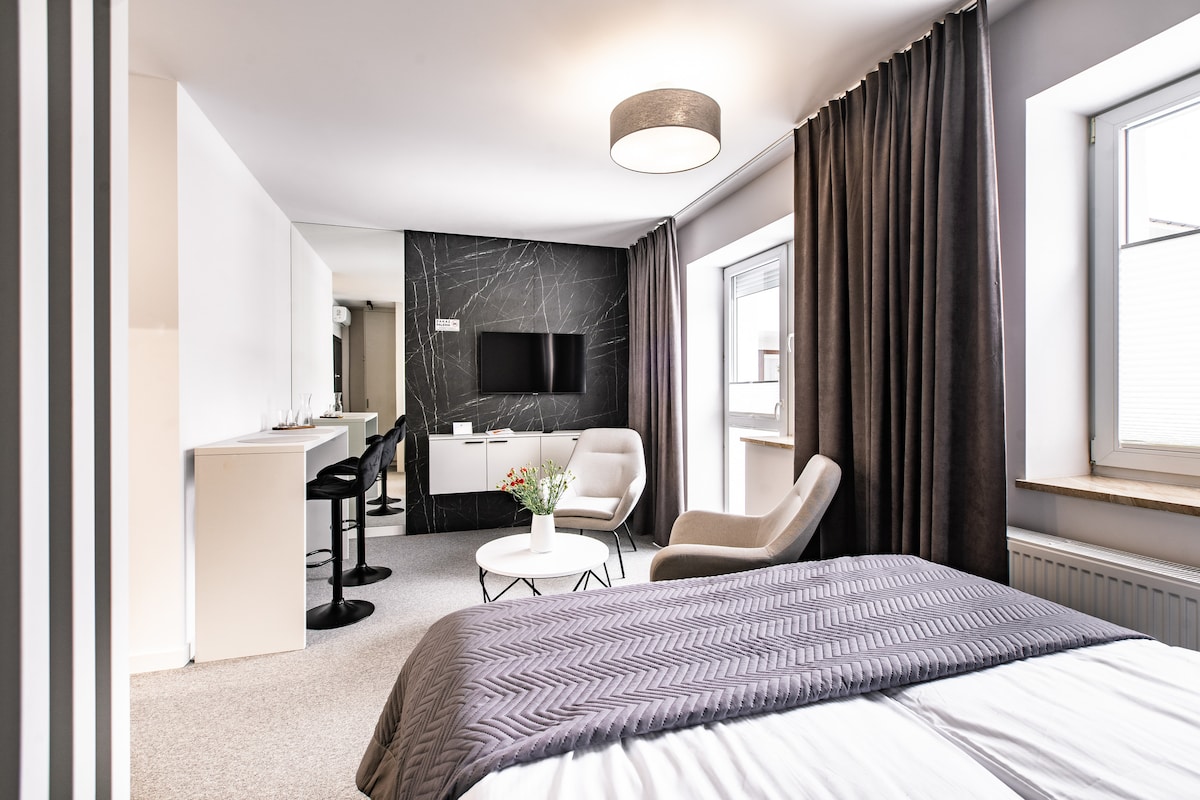 Naša stanovanja so bila zasnovana s pozornostjo do detajlov in združujejo sodoben slog s funkcionalnostjo, ki zagotavlja največje udobje. Vsako stanovanje je sestavljeno iz prostorne dnevne sobe s kuhinjsko nišo in ločene kopalnice. Kuhinje so popolnoma opremljene, kar vam omogoča, da si sami pripravite obroke. V celotnem hotelu je na voljo brezplačen Wi-Fi. Poleg tega je v stavbi pralnica.