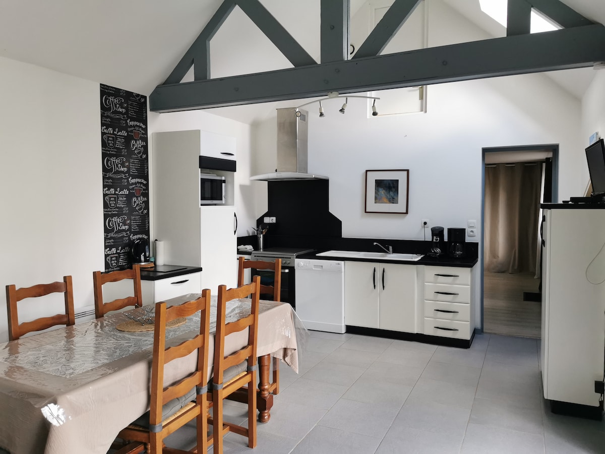Gite Laiterie est un 6/8 places Il est situé sur notre exploitation avec une vue sur la campagne angevine et sur la stabulation (lieu de vie des vaches) Une pièce à vivre de 40m² salon/salle à manger/cuisine tout équipée, frigidaire/congélateur, plaque induction, bouilloire, cafetière combiné PROLINE . Une salle de douche et wc séparée A l'étage 2 chambres, 1ere un lit de 160x200 et un lit de 90x190. La 2eme 3 lits de 90x190 deux lits peuvent être réunis. Un BZ de 160x200 soumis à condition