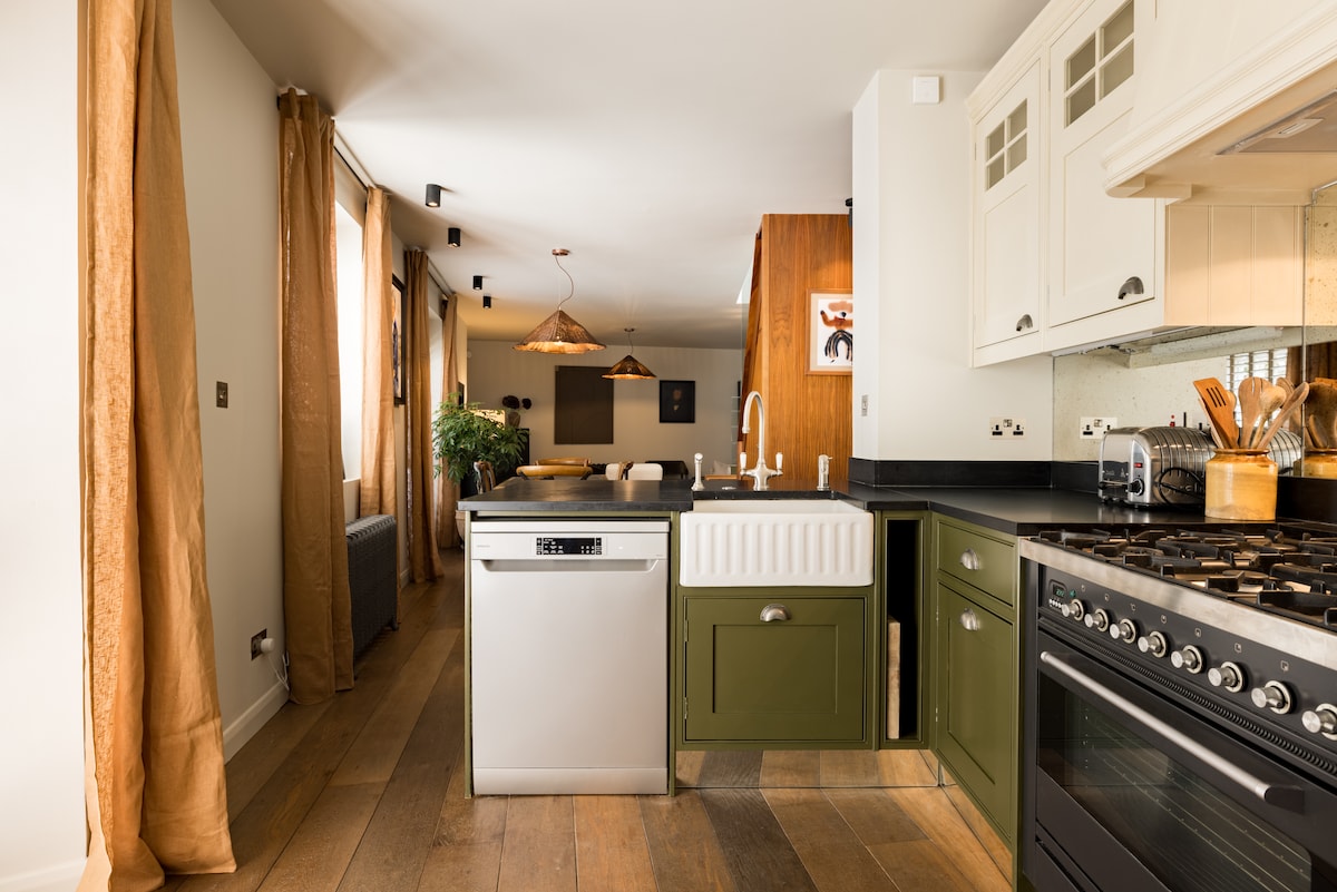 Overlooking the fields, this luxury top floor space invites you to unwind. Ultra-clean, peaceful and beautifully styled. Equipped with everything you need and more. Brew fresh bean-to-cup coffee with the Ninja Luxe Coffee Machine. Stream your favourite shows on the Smart TVs, play board games as a group or work where the view inspires you. Whatever the purpose of your stay, working or relaxing - this is the place to be! London is close by, but feels like a world away. Always a place to park too!