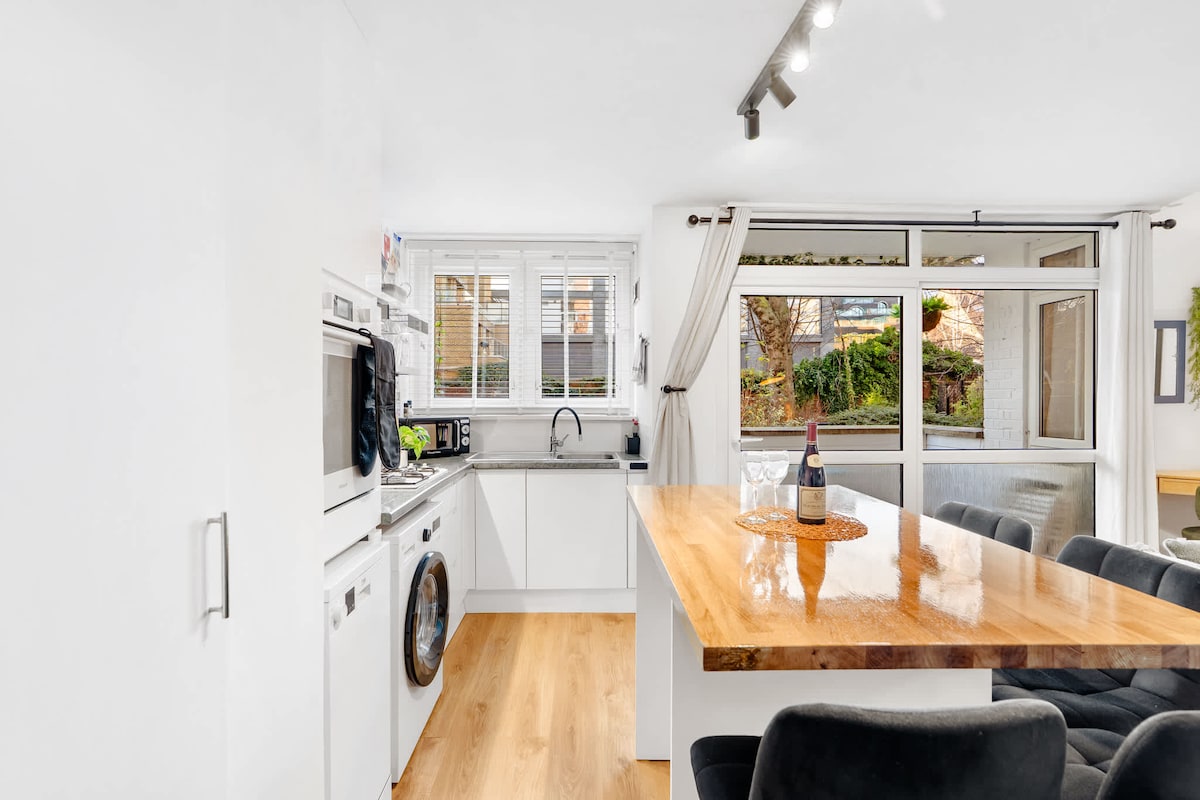 To je prenovljena zgodovinska dvonadstropna vrstna hiša na območju York Square v vzhodnem Londonu s parkiriščem. Svetlo in čisto s pohištvom Scandi in dekoracijo v skladu z visokim standardom na mirni stanovanjski ulici. Sodobna kuhinja, pomivalni stroj, pralni in sušilni stroj. Velike spalnice (zakonska postelja in zakonska postelja) in bujni zasebni vrt za vaš užitek. Profesionalno kemično očiščene rjuhe in brisače za vaše udobje. OPOMBA - vrt je dostopen, vendar ni pospravljen v zimskih mesecih (oktober - marec)