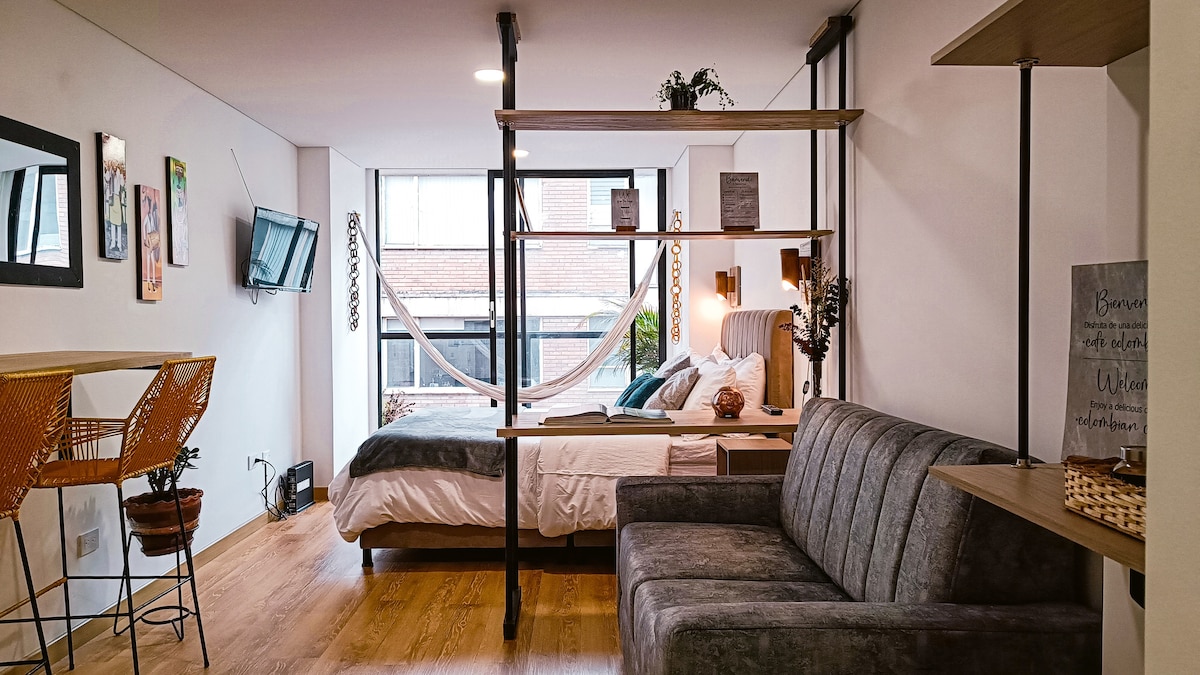 🏅 Priljubljeno gostom ⭐ Sodobna garsonjera v osrčju La Candelarie, najbolj zgodovinske in kulturne soseske v Bogoti. Uživajte v panoramskem razgledu na andske hribe iz zgornjega nadstropja. Stopnice od trga Plaza de Bolívar, Museo del Oro, Museo Botero in še marsikaj drugega. Stavba je nova in ima telovadnico, streho z razgledom, parkirišče in 24-urno varovanje. Idealno za popotnike, ki iščejo udobje, umetnost, zgodovino in odlično lokacijo v središču mesta.