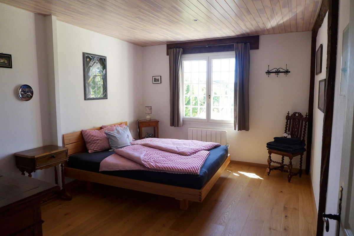 Udobna soba s površino 16 m2 z zakonsko posteljo, pisarno in zasebno kopalnico. Sosednje stranišče. Naša hiša, ki se nahaja na koncu mirne ulice, s pogledom na gozd in polje sliv, je zelo udobna. Uživajte v miru in petju ptic iz bližnjega gozda. Mirno bivališče v bližini tržnice Libos v četrtek zjutraj, Château de Bonaguil, bastides Monflanquin, Monpazier, Villeréal itd. V kleti lahko sprejmemo kolesa in napolnimo baterije.