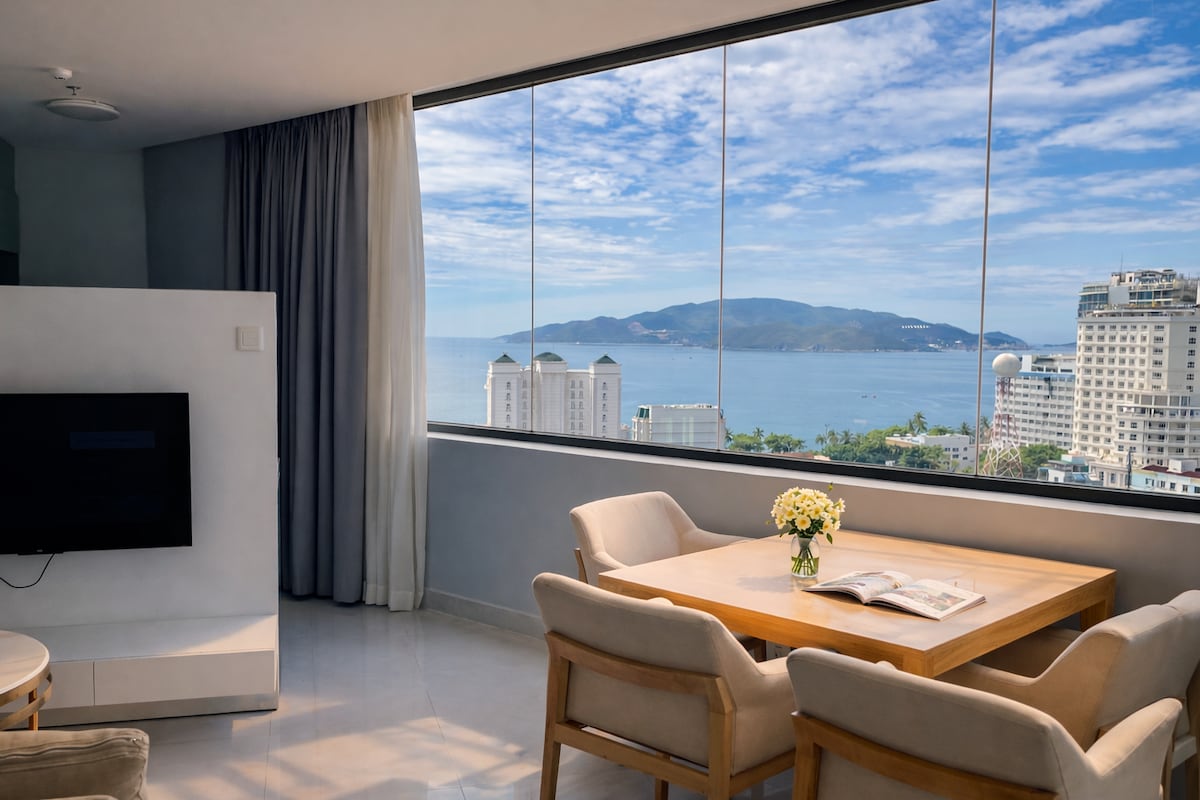Uživajte v elegantnem doživetju v tem prostornem enosobnem stanovanju z 1 spalnico v hotelu DQua s 5 zvezdicami v Nha Trangu, ki se nahaja v središču mesta. Vključuje ločeno spalnico z zasebnim balkonom, popolnoma opremljeno kuhinjo in širok, udoben kavč v dnevni sobi. Okna od tal do stropa nudijo osupljiv panoramski razgled na ocean in mestno obzorje. Le nekaj korakov stran od plaže je kot nalašč za pare ali samostojne popotnike, ki iščejo udobje in eleganco.