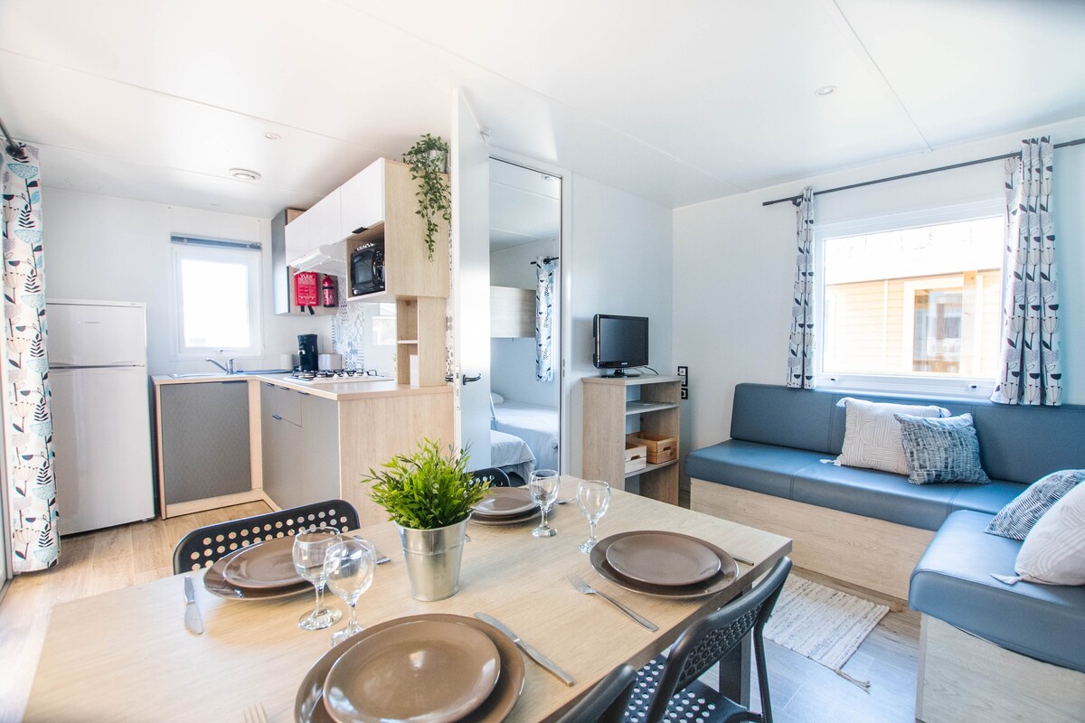 **Udobno prenočišče pod borovci, le nekaj korakov od oceana** Bivajte v popolnoma novi, sodobni, klimatizirani in popolnoma opremljeni mobilni hišici, ki se nahaja v mirnem in prijaznem kampu. Uživajte v privilegiranem naravnem okolju in slikovitih vožnjah s kolesom, le kratek sprehod od najboljših plaž Les Landes — za osvežujoče in nepozabne počitnice. - Posteljnina in brisače so na voljo -