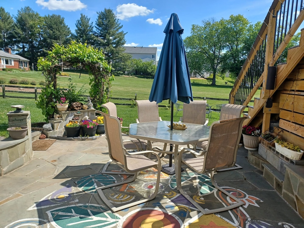 Welcome to our gorgeous apartment in Virginia's wine country! Enjoy a private entrance, kitchenette, and a beautiful master bedroom. Our location puts you just 5 mins away from restaurants, breweries, hiking trails, and downtown Leesburg. Use our 2 available bikes to explore. Stay connected with fast Wi-Fi and unwind on the patio with expansive views. Free parking and nearby Walmart make stocking up easy. Let us make your stay in Leesburg unforgettable!