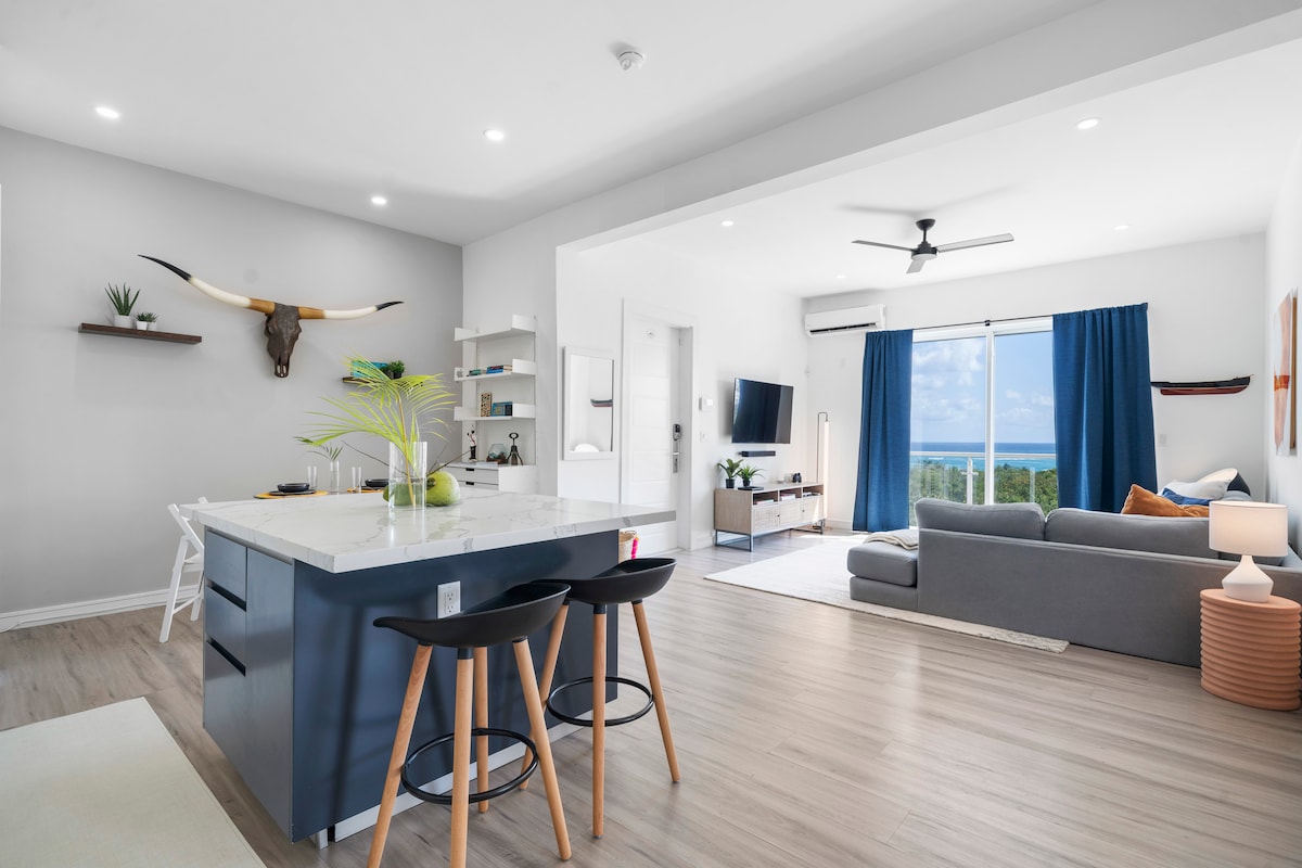 A spacious two-bedroom, 2.5-bathroom penthouse set directly on Love Beach in Nassau, The Bahamas. Perched on the fourth floor, this beautiful residence offers stunning views of the beach and turquoise ocean below. The bright open living area and full kitchen create a comfortable space to relax and gather, while the elevated setting brings cooling breezes and a true beachfront feel. It is the perfect place to enjoy the beauty and calm of Love Beach from above.