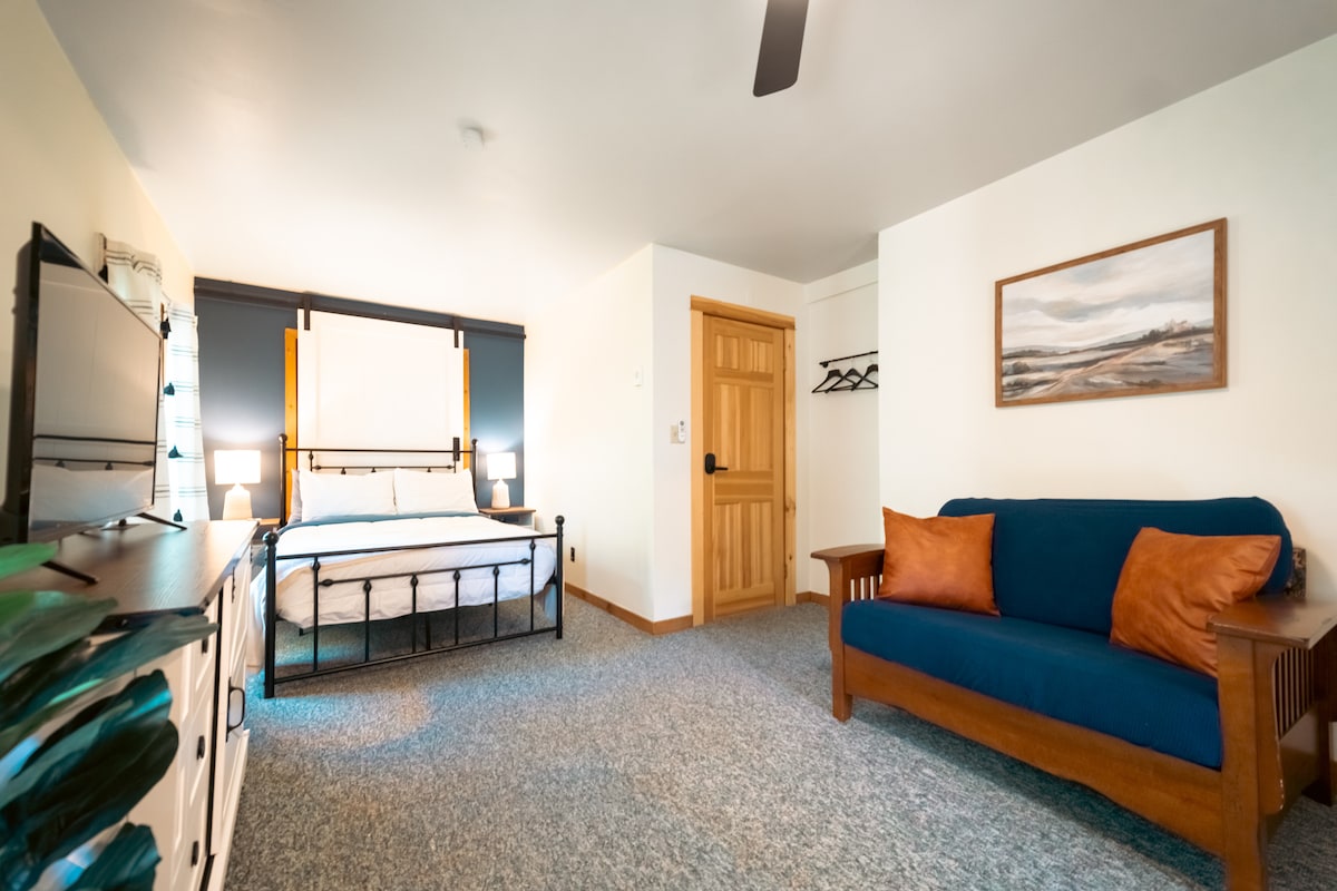 Franklin's 80 Loons offers a modern, cheerful one-bedroom apartment with AC, a full-sized bed, cot & convertible couch. Driveway parking on quiet residential street. Short walk to new rail trail, Lake Flower & downtown shops, galleries & restaurants. This comfortable private space is the perfect base camp for hiking, skiing, snowboarding, cycling & paddling activities. Relax in the evening with a book, puzzle, board game, or campfire. Celebrate the Adirondacks with us. House also available.