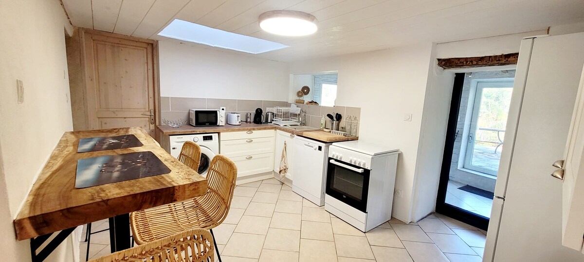 Ta romantična nastanitev, obdana z naravo, vas bo očarala. Uživali boste v zunanjem SPA-ju, ki ni spregledan, in v pravem lesenem stanovanjskem bungalovu. Na voljo: masažna kad, savna, bazen, zunanja kuhinja, zunanji tuš, zunanje ogrevanje in masažna miza V koči so 3 sobe: Zelo udobna spalnica/dnevna soba s posteljo 140/200 Popolnoma opremljena kuhinja Kopalnica s hidromasažno kabino Je majhen, vendar funkcionalen.