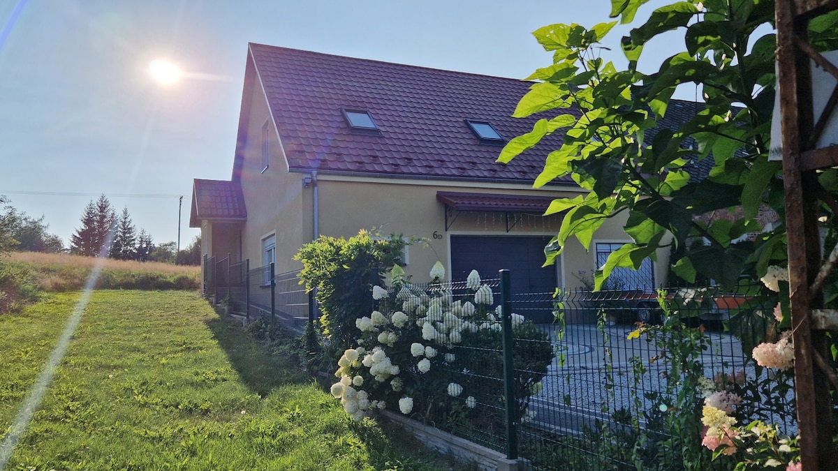 Ein Ort zum Entspannen besonders für Familien, gerne auch mit Hund. Kinder können im Garten spielen, schaukeln, Trampolin springen, Baum hochklettern. Lagerfeuerstelle im Garten. Ein einzigartiger Glasanbau für jedes Wetter. Uriges Wohngefühl im Lärchenholz. Feuer im Kaminofen macht den Esstisch gemütlich. Rund um das abgegrenzte Gelände sind Wälder und kleine Seen. Unweit das Iser- und Riesengebirge zum Wandern, Radeln und Ski Fahren, sowie ein Stausee und alte preußische Adelsschlösser.