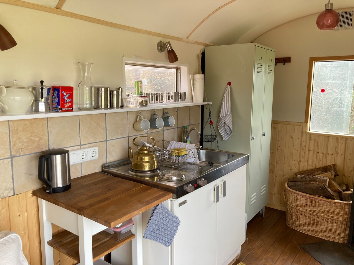 Während Eures Aufenthaltes bei uns wohnt ihr in einem liebevoll restaurierten, großzügigen Bauwagen mit Terrasse und Gartenteil . Er ist auch für lange Aufenthalte eingerichtet. Im Winter wird mit Holz und Brikets geheizt und es wird schnell kuschelig warm. Fließend Kaltwasser gibts im Wagen nur in der frostfreien Zeit! Pferde können mitgebracht werden, 1 ha. Koppel direkt am Wagen. Badbereich und Sauna liegen 50m vom Haupthaus entfernt.