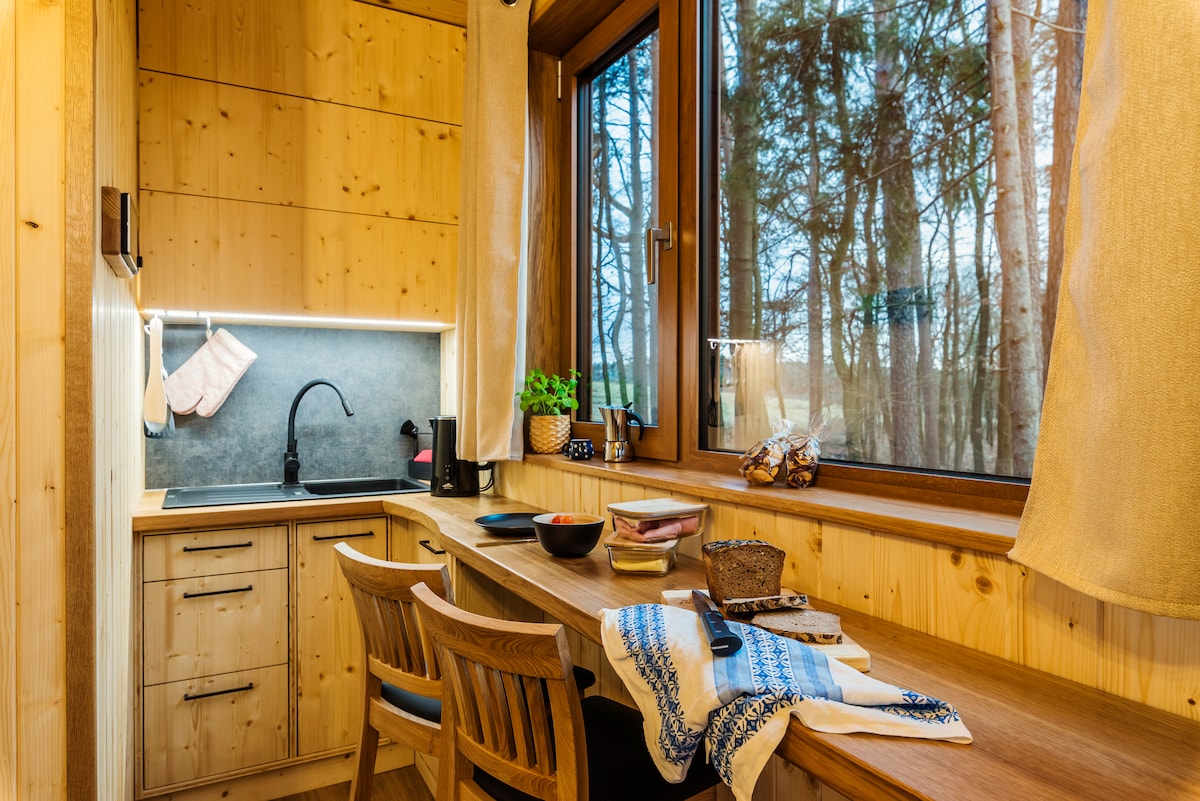 Nastanitev v sozvočju z naravo v popolni zasebnosti, sprostite se v finski savni ali zunanjem kopališču z vrtnim žarom. Zvečer lahko doživite romantiko ob vročem kaminu ali pa opazujete zvezde na dvignjeni terasi. Udobna notranjost nudi popolnoma opremljeno kuhinjo s štedilnikom, vključno s posodo, električnim grelnikom vode in hladilnikom. Kopalnica s prho in splakovalnim straniščem. Trudimo se biti nežni z naravo, zato je kopalnica opremljena tudi z organsko kozmetiko. Hiška na deželi je opremljena tudi z omrežjem Wi-Fi.