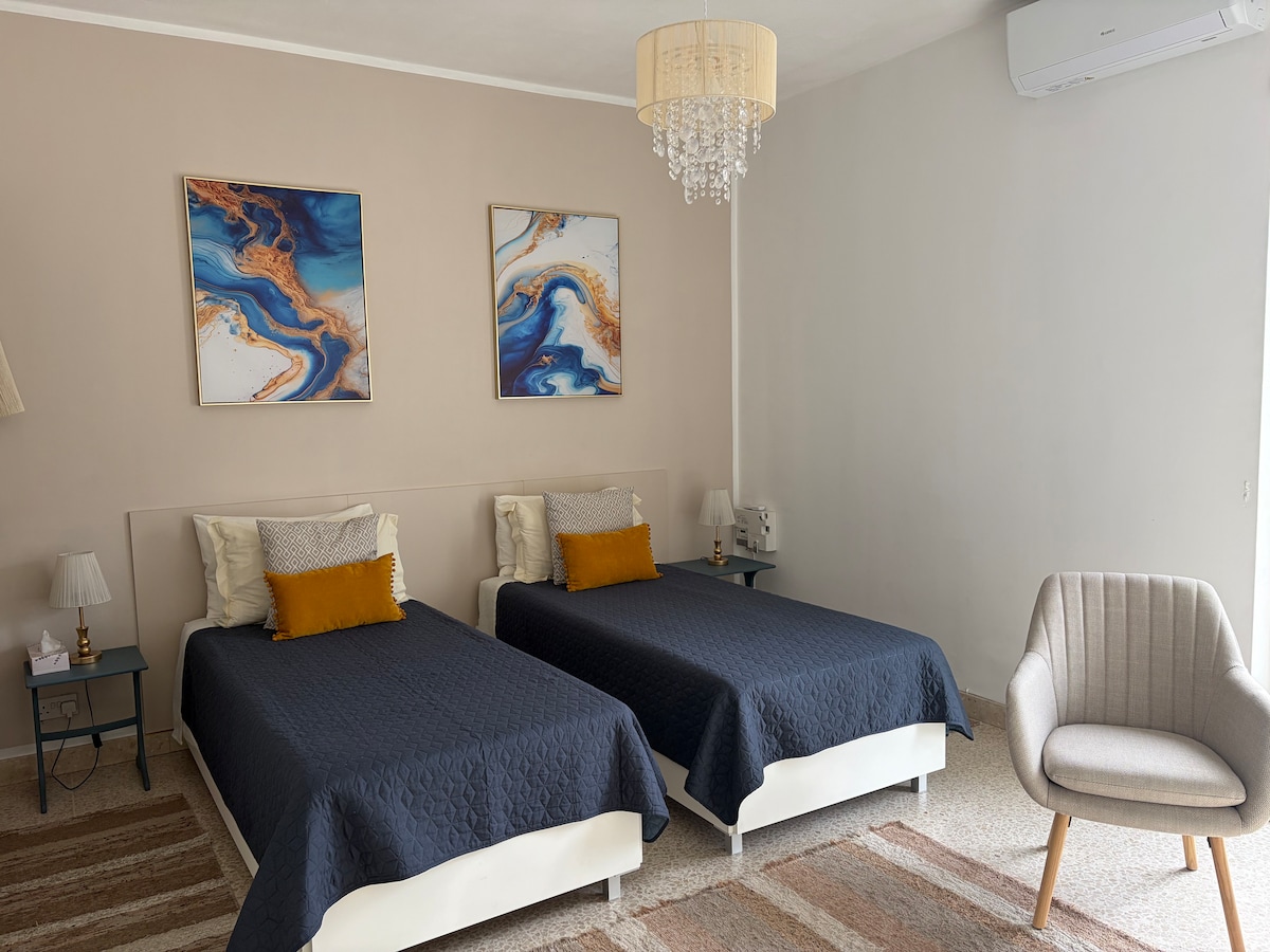 Stanovanje se strateško nahaja med dvema zalivom Marsaskala, le 5 minut hoje od morskega sprehajališča, restavracij, trgovin in avtobusne postaje ter 10 minut hoje do kopališč in plaž v zalivu St. Thomas. Stanovanje ima 2 spalnici, 2 kopalnici, kombinirano kuhinjo in dnevni prostor, sončno teraso, klimatsko napravo, Wi-Fi, Netflix TV in pralnico. Vključeni so tudi lahki zajtrki. Za zasebno parkiranje je na voljo tudi brezplačna garaža čez cesto.