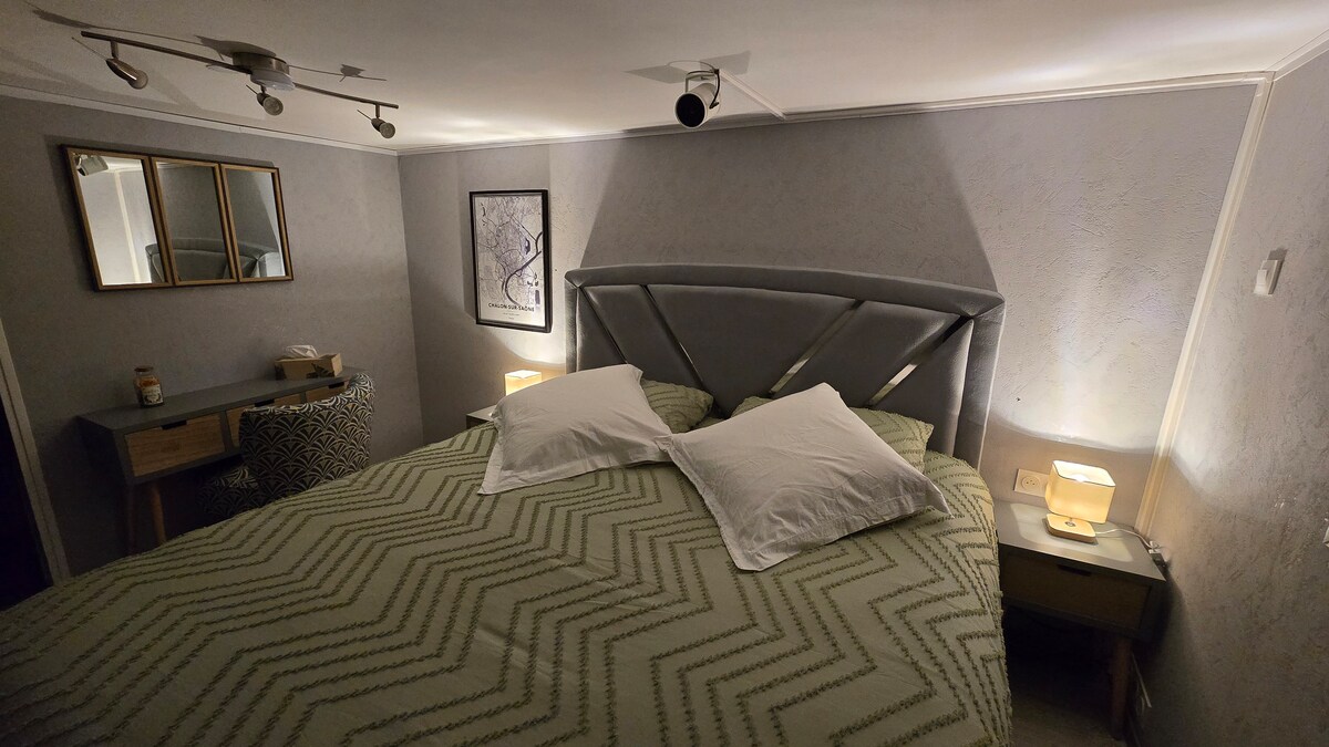 Ta edinstvena nastanitev, ki se nahaja v osrčju zgodovinskega središča Chalon sur Saône, vas bo zapeljala s svojim francoskim šarmom z izpostavljenimi kamni in okvirji ter vsemi svojimi značilnostmi. Kuhinja je opremljena z vinsko kletjo, dnevna soba s kavčem, omrežjem Wi-Fi in Netflixom. Kopalnica s prho in kadjo Spalnica v medetaži z zakonsko posteljo, opremljena z garderobo in predalom za shranjevanje. To predelano stanovanje bo zapeljalo s svojo edinstveno zasnovo in poskrbelo, da bo vaše bivanje nepozabno.