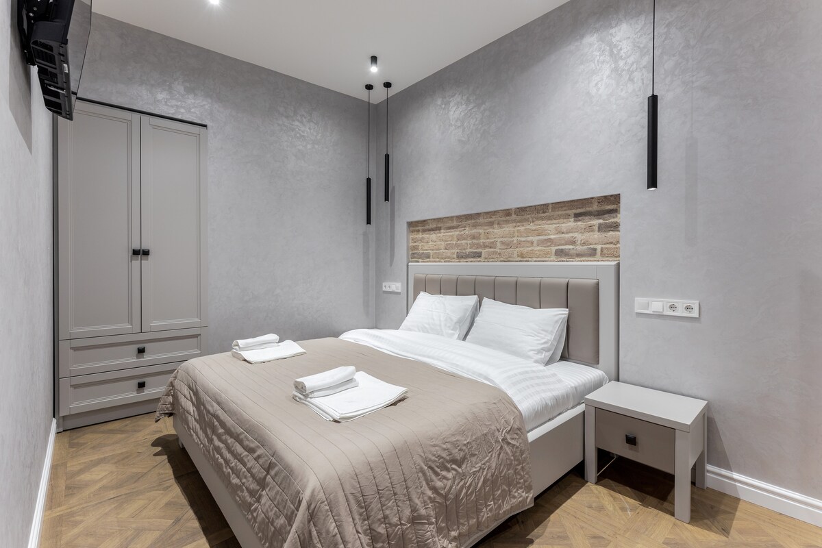 Najemite nova stanovanja, z obnovljenim enosobnim stanovanjem v centru, 5 minut hoje od trga Sq.Market. Stanovanje je izdelano v svetlih barvah, kot nalašč za dve osebi, vendar lahko udobno sprejme 4 osebe (2 +2otroka). Velika zakonska postelja, kavč.