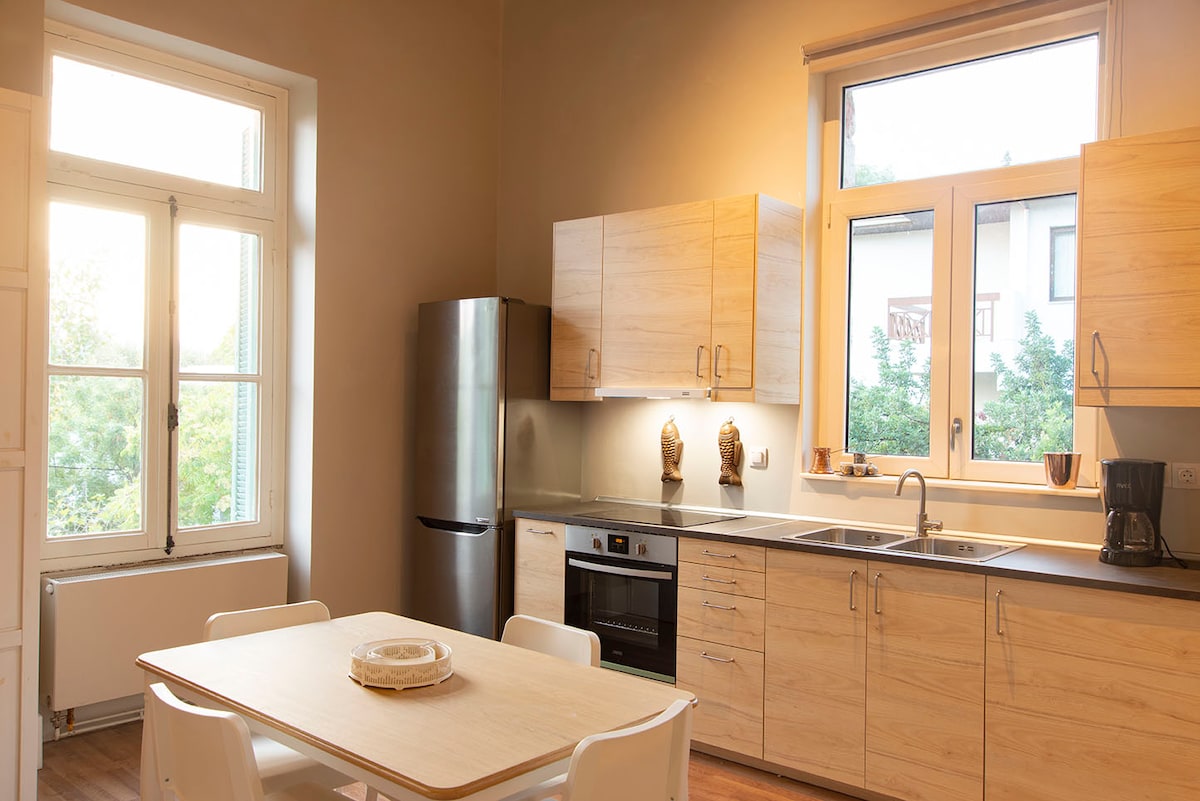 A 3 min walk from the train station Iraklio [green line]. Within a lash garden. High ceilings, nice textiles and vintage furniture is part of the building's character. This excellently preserved house offers a unique experience of staying in an active but not touristic neighborhood of Athens. Restaurants, coffee shops, kiosks, bakeries, open air green market, supermarkets, all within 5 min walking. Ease access to any part of the city. Feel free to contact me in English, Greek or German.
