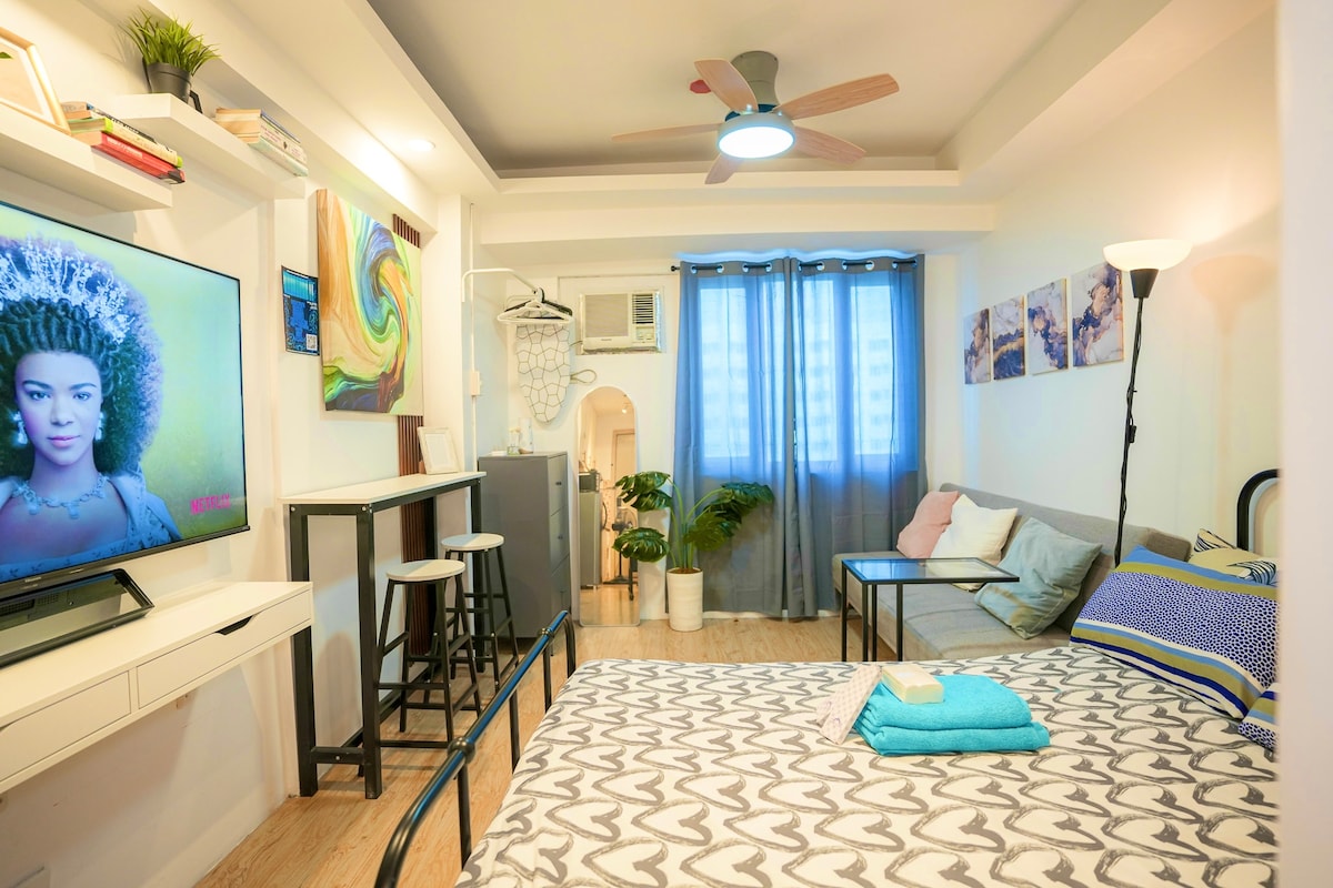 Vaše idealno delovno bivanje z neprekosljivo lokacijo! V osrčju centra Araneta je naš studio opremljen z namenskim delovnim prostorom (27-palčni monitor, tipkovnica, delovna postaja) – prinesite samo svoj prenosnik. Uživajte v Wi-Fi povezavi s hitrostjo do 400 Mb/s, udobni zakonski postelji, balkonu s pogledom na mesto in 43-palčnem televizorju z Netflixom. Le kratek sprehod vas loči od večjih nakupovalnih središč, kot so Ali Mall, Gateway Mall in SM Cubao. Vse glavne prometne linije (MRT, LRT, avtobusne postaje) in EDSA so tik pred vrati. Rezervirajte prenočišče, kjer se združita delo in udobje.