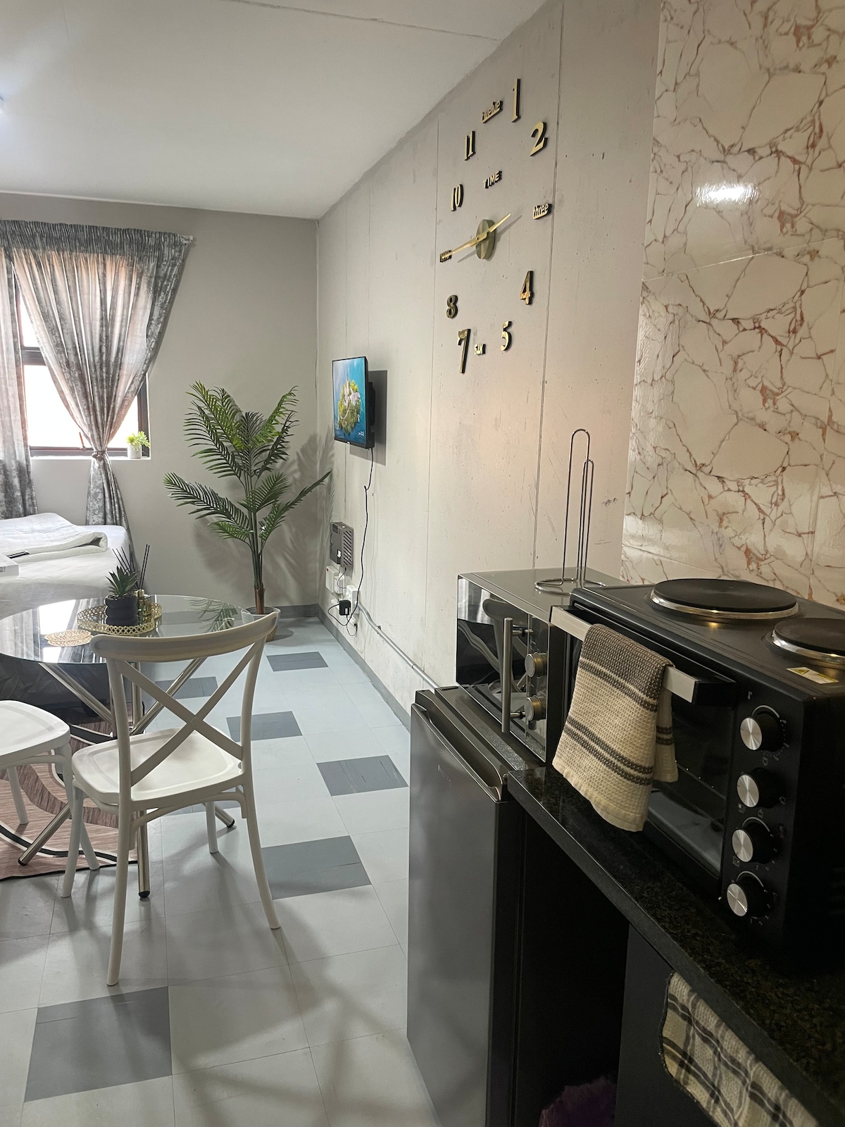 Doživite stanovanje z edinstvenim slogom v Mabonengu. Ta premišljeno zasnovan prostor ponuja luksuzno bivanje v bližini galerij, restavracij in nočnega življenja v Joburgu. Uživajte v veliki zakonski postelji, hitrem WiFi-ju, 55-palčnem pametnem televizorju 4K z Netflixom, pralnem stroju, pohištvu po meri, osupljivem dvometrskem ogledalu, elegantnih marmornatih tleh, popolnoma opremljeni kuhinji, sončnem balkonu s pogledom na vrt in bazen ter v kabini za prhanje. Zaradi 24-urne varnostne službe je vaše bivanje varno, zasebno in brezskrbno.
