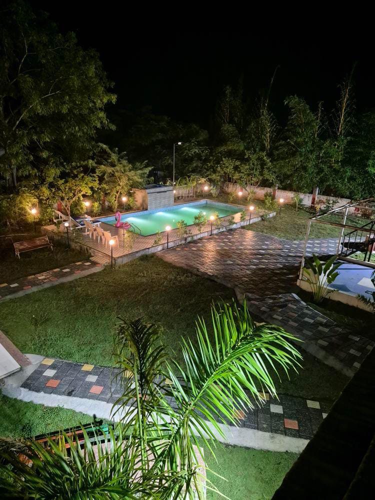 Escape to our private farmhouse featuring 2 fully air-conditioned villas, perfect for families and groups. Enjoy Ambika’s biggest pool, rain dance setup, and a relaxing gazebo surrounded by greenery. Host BBQ nights and bonfires under the stars with a big speaker for music. With 2 kitchens, fridges, and all essential utensils, your stay is comfortable and fun—ideal for weekend getaways, celebrations, or peaceful retreats.