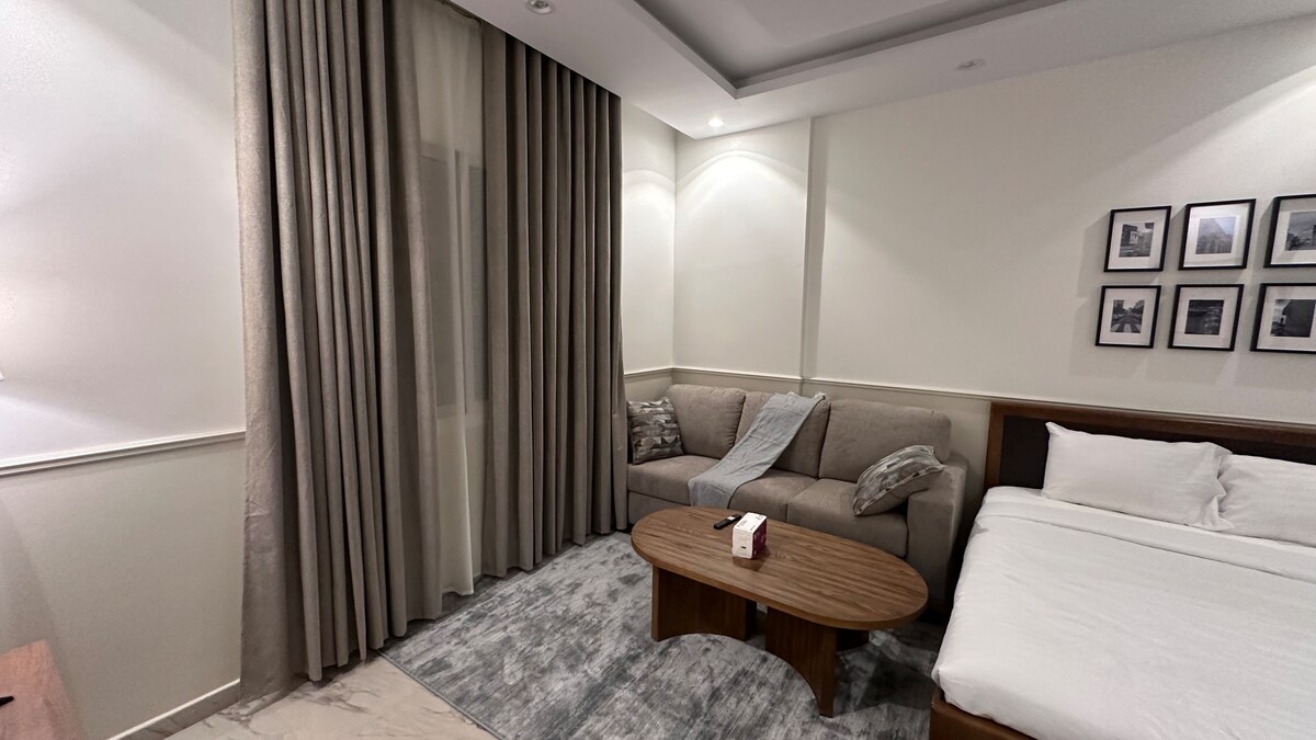 Razkošna garsonjera z: • Udobna glavna postelja, ki zagotavlja miren spanec. • Eleganten prostor za sedenje z udobnim milom. • HDTV za gledanje. • Kavni kotiček za tople napitke. • Pripravljena kuhinja. • Zasebna kopalnica z vsemi zahtevami šampona, mila in gela za prhanje za popolno udobje. V bližini : Prerokova mošeja je oddaljena manj kot 10 minut Železniška postaja Al-Haramain manj kot 10 minut Letališče Prince Mohammed bin Abdulaziz manj kot 15 minut