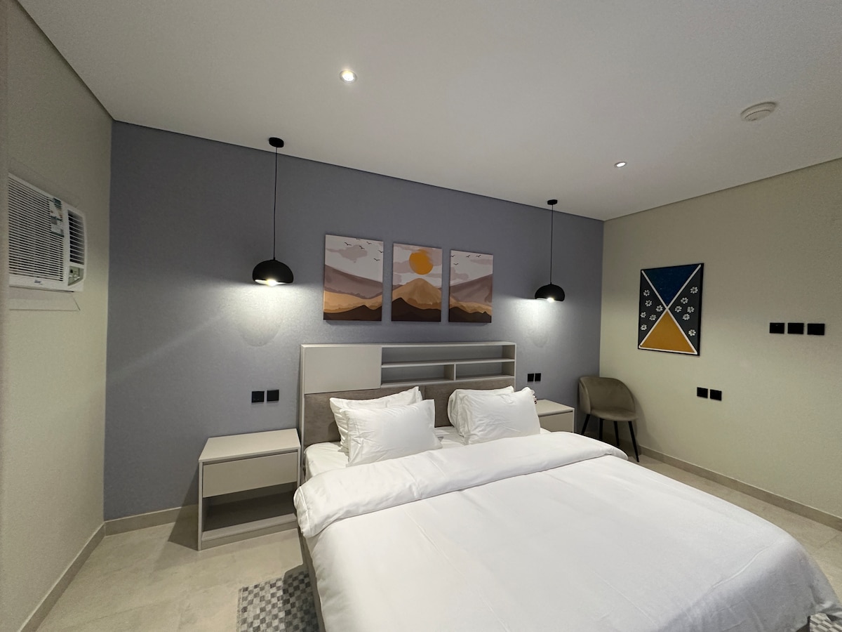 Gre za stanovanje s sobo, salonom, kuhinjo in kopalnico, ki se nahaja v središču središča središča kampusa, v središču restavracije, kavarn in s pogledom na Wadi Al Aqeeq. Od Islamske univerze je oddaljen 3 minute vožnje. Zasnovan je v udobnih barvah in sodobnem oblikovalcu. Na voljo je 57-palčni zaslon Netflix in priča ter ima dovolj prostora, popolno zasebnost in pameten vstop. Želim vam srečno bivanje in Bog vas blagoslovi, dragi gost