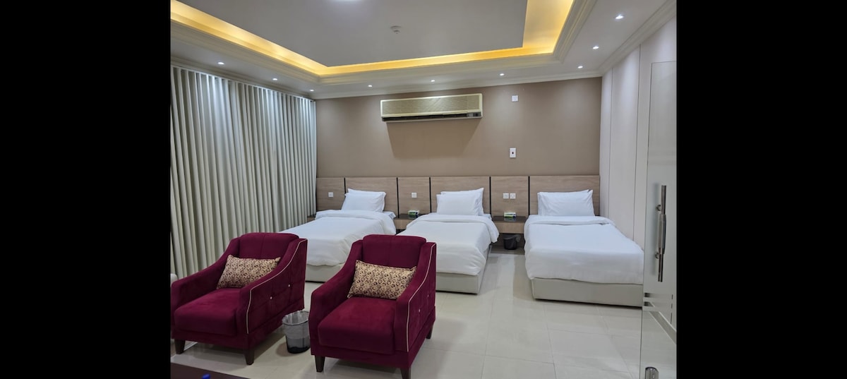 Luksuzno stanovanje na ulici King Abdulaziz Road, približno 4-7 minut vožnje od prerokovega Harama 🚗 Zakonska postelja (King) in enojna postelja (King) Kuhinja - mikrovalovna pečica - hladilnik - pranje in čisto stranišče Urejena zasnova in udoben prostor. Internet je na voljo na do 250 mega in brezplačno parkiranje. Lokacija v živo v bližini restavracij, kavarn in tržnic. Samostojni vstop in non stop storitev za popolno in mirno bivanje.