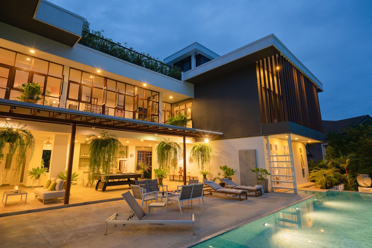 Modern pool villa nestled in nature—perfect for a peaceful escape with family or friends. Surrounded by lush greenery, it's just 45 mins from Chiang Mai Airport. Located in Mae Rim, it is a short drive to attractions such as elephant sanctuaries, Siam Insect Zoo and Tiger Kingdom and Mon Jam. Airport pickup available for a fee, though having your own transport is recommended. Ideal for relaxing, exploring, and reconnecting with nature.