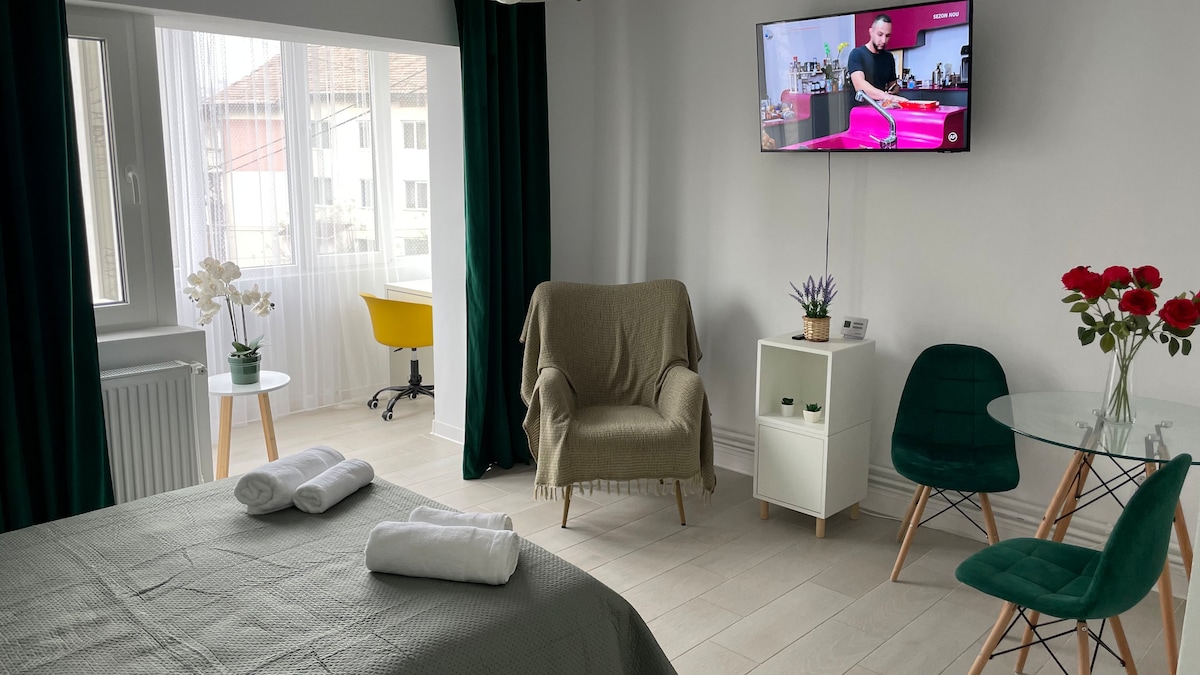 Poskrbite, da bo vse preprosto v tem mirnem bivališču, ki se nahaja v središču mesta. Garsonjera se nahaja v pritličju. Nahaja se nasproti športne dvorane Zalau in kluba Divino. Pred kratkim prenovljeno in sodobno opremljeno. Ima vso opremo, vključno s klimatsko napravo in pralnim strojem s sušilnim strojem. Nahaja se v bližini avtobusne postaje, Kauflanda,športne dvorane,kluba Divino,bencinske črpalke, nakupovalnega središča Value Center. Možnost samostojnega prihoda. Brezplačno zasebno parkiranje.
