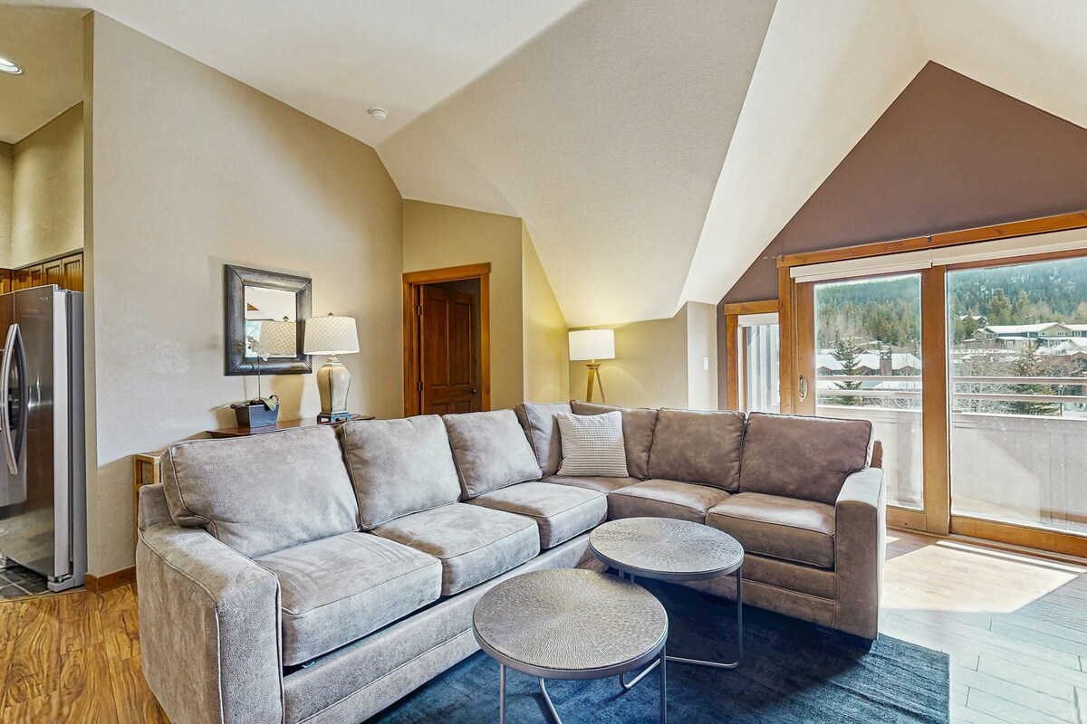 Enjoy an in-town location with Peak 9 base area and Main Street short walks across the street. Fully updated and comfortable. HUGE private patio. Master features a king and bunk bed with attached bathroom The guest room has a queen bed and adjacent bathroom. The kitchen is open to the dining area and living room with sofa bed & gas fireplace. Dedicated space in garage. Columbine Pool access seasonally. Bathrooms completely renovated and brand new living room furniture installed summer 2025.